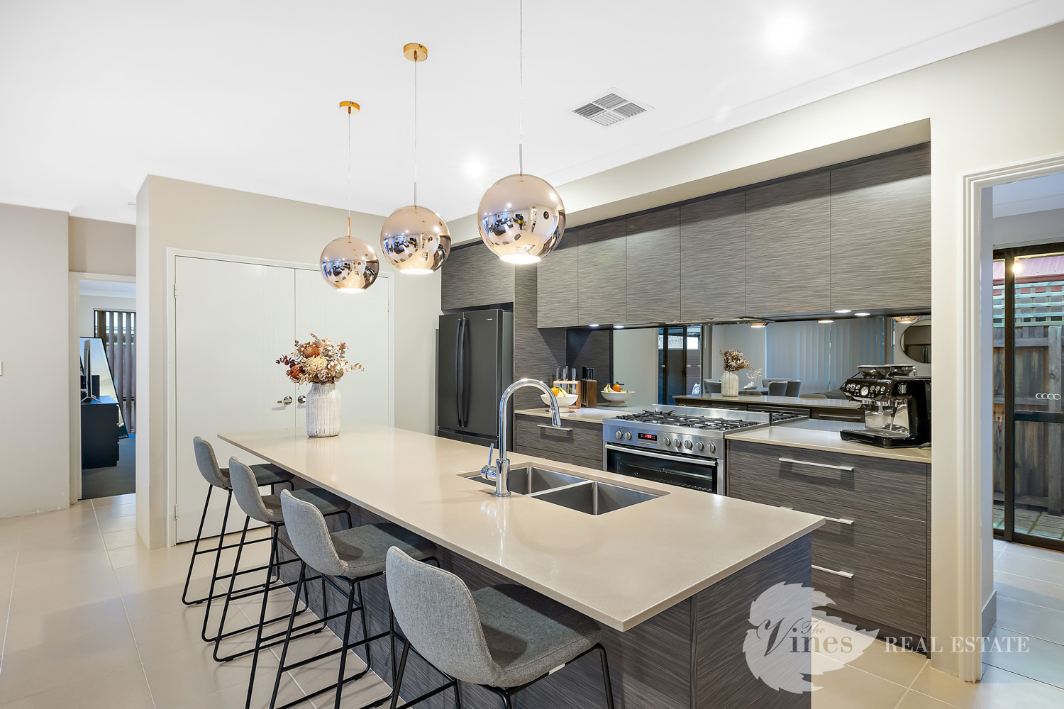 The heart of the home is the stunning gourmet kitchen, boasting stone benchtops, a large island with pendant lighting, a freestanding oven with gas cooktop, glass splashback, dishwasher, double fridge recess, and double door pantry. The adjacent laundry is cleverly placed to serve as additional prep space when needed, and the walk-in linen cupboard ensures ample storage.