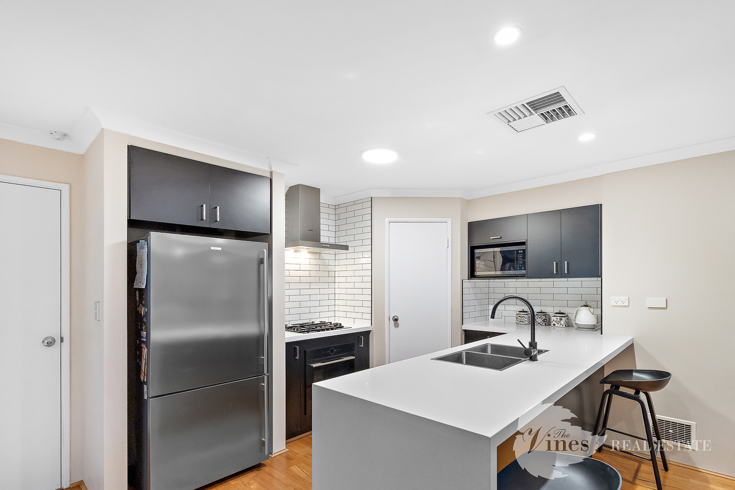 The heart of the home is the recently renovated kitchen, featuring premium Bosch appliances, 40mm stone benchtops with a waterfall edge, sleek subway tiles, a gas cooktop, 600mm oven, microwave recess, and convenient shopper’s access from the double garage, which is securely accessed via the rear laneway.