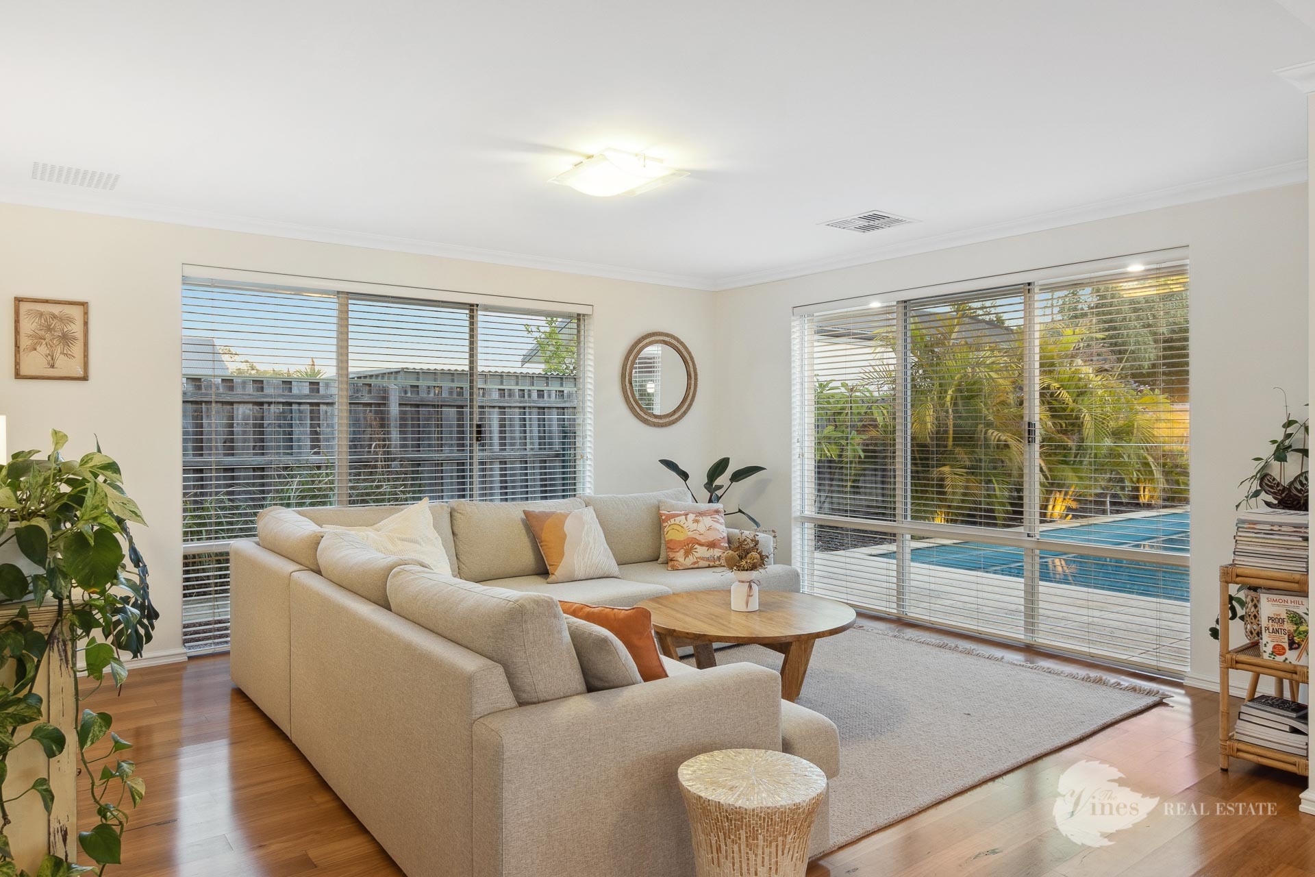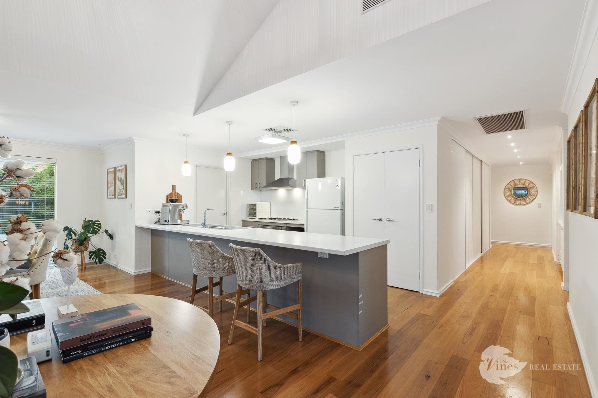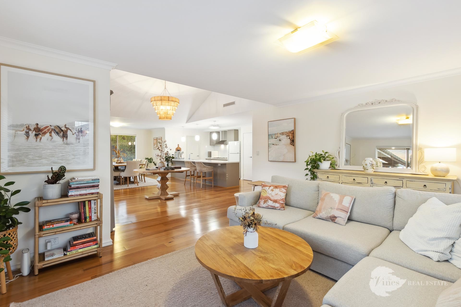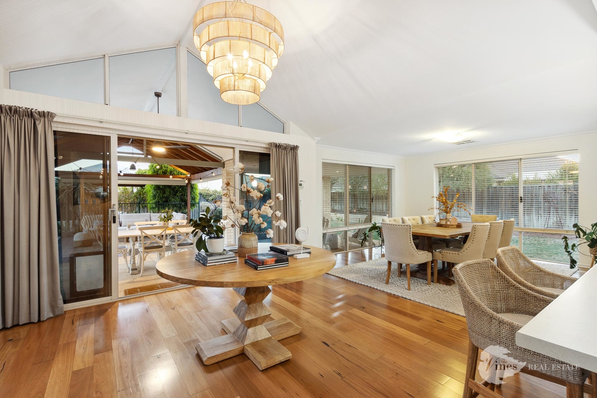 Step inside, where a wealth of living space unfolds, featuring warm timber floorboards, elevated ceilings, and tasteful lighting that complements the abundant natural light. The generous kitchen overlooks the expansive communal areas, including living, dining, games, and outdoor spaces.