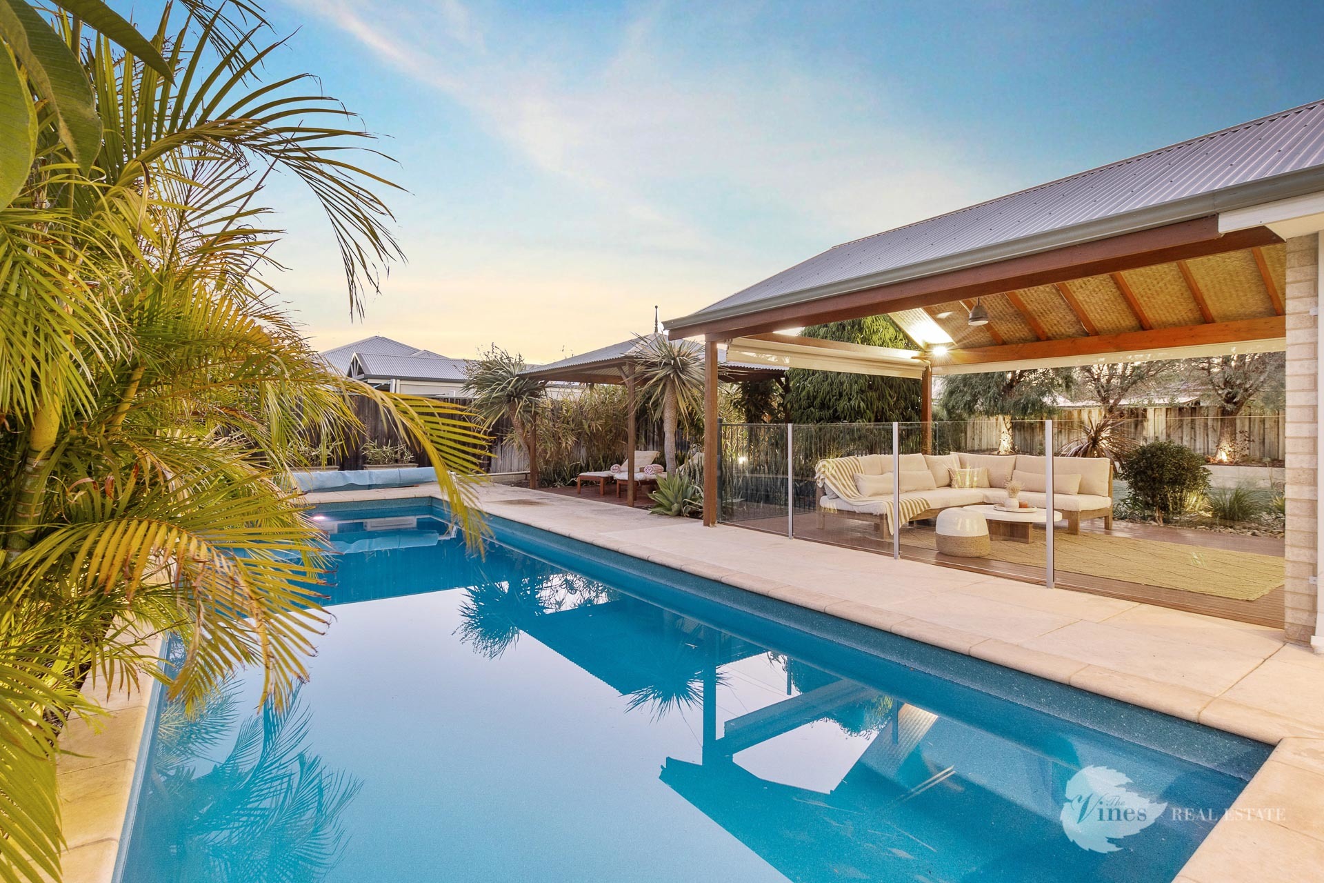 – Resort style 10m x 4m pool w secluded cabana + liquid limestone