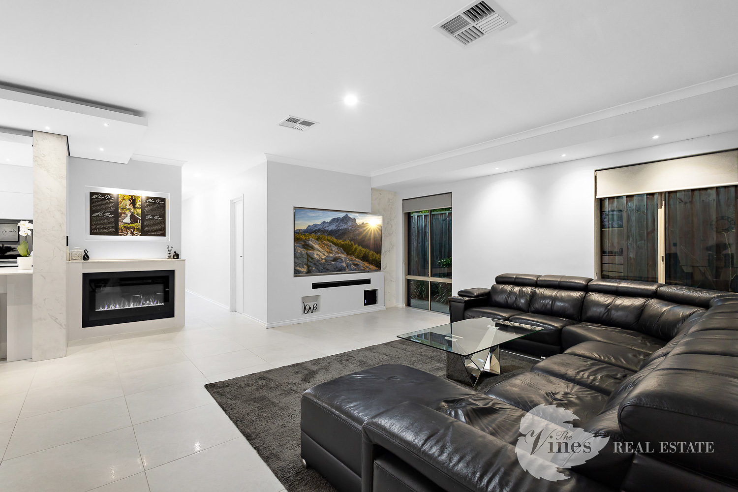 The open-plan living and dining area feels light, welcoming, and connected, with porcelain tiles through the central heart of the home, raised ceilings, and LED downlights throughout. A custom-built gas fireplace adds warmth and ambience, making it just as inviting in winter as it is in summer. Zoned reverse-cycle air conditioning ensures year-round comfort for everyone.