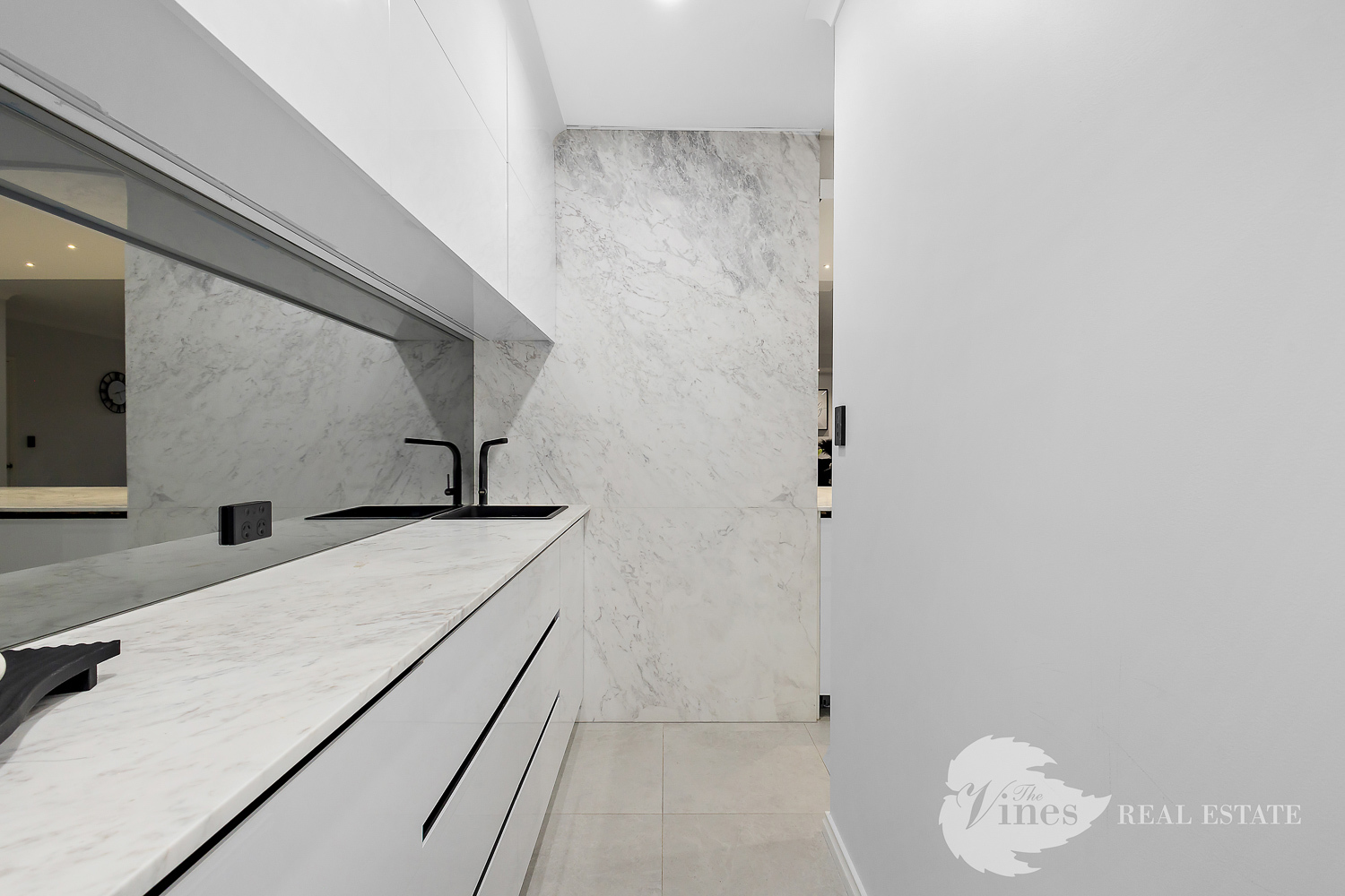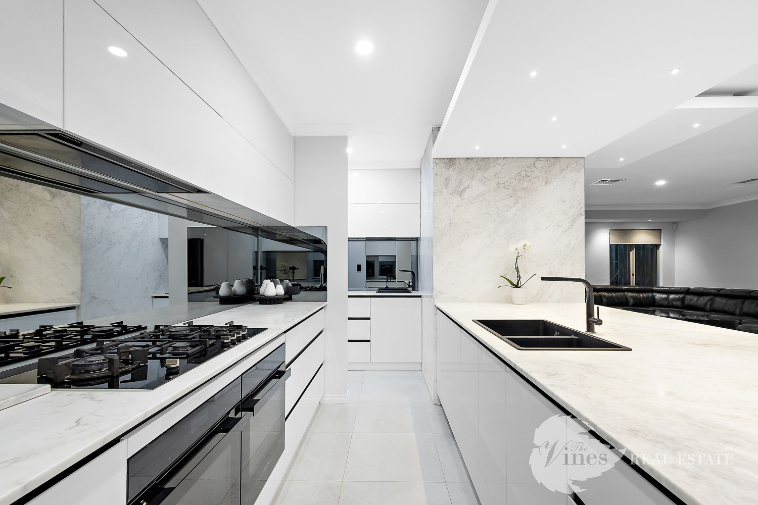 At the heart of the home is the fully renovated kitchen, designed for both everyday living and entertaining. Marble stone benchtops with a stunning waterfall edge, black accent hardware, soft-close cabinetry, and storage galore create a space that’s as practical as it is beautiful. Featuring double ovens, a 900mm gas cooktop, large double fridge recess, scullery, coffee station, and stylish smoked mirror splashbacks, this kitchen is where family meals and celebrations naturally come together.