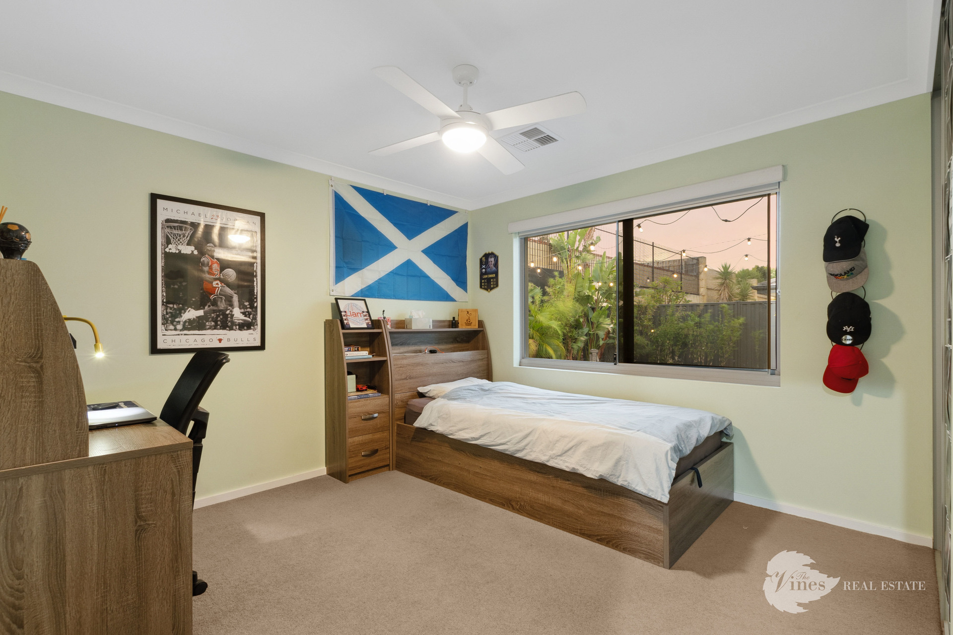 At the heart of the home is your dream kitchen, showcasing stone waterfall benchtops, a 900mm oven and gas cooktop, an integrated dishwasher, a mirror-glass splashback, and a breakfast bar. Ample storage is provided with a double door pantry and sleek built-in cabinetry in the dining area. The separate children’s wing offers four generous bedrooms , each with built-in robes and ceiling fans, ensuring space and privacy for the whole family.