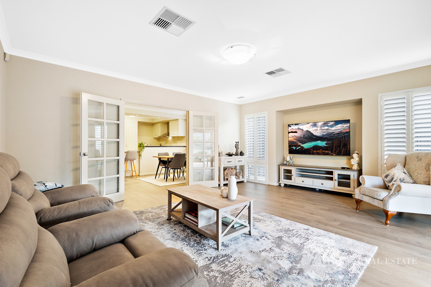 Inside, you’ll find coffered ceiling features, beautiful flooring, French doors, abundant natural light, and feature plantation shutters to most rooms. The master suite is a serene retreat, complete with a walk-in robe, ensuite with dual vanities, a bathtub, and clever privacy from the rest of the home via double French doors – perfect for multigenerational living. The remaining bedrooms feature double sliding built-in robes and are located in their own wing.