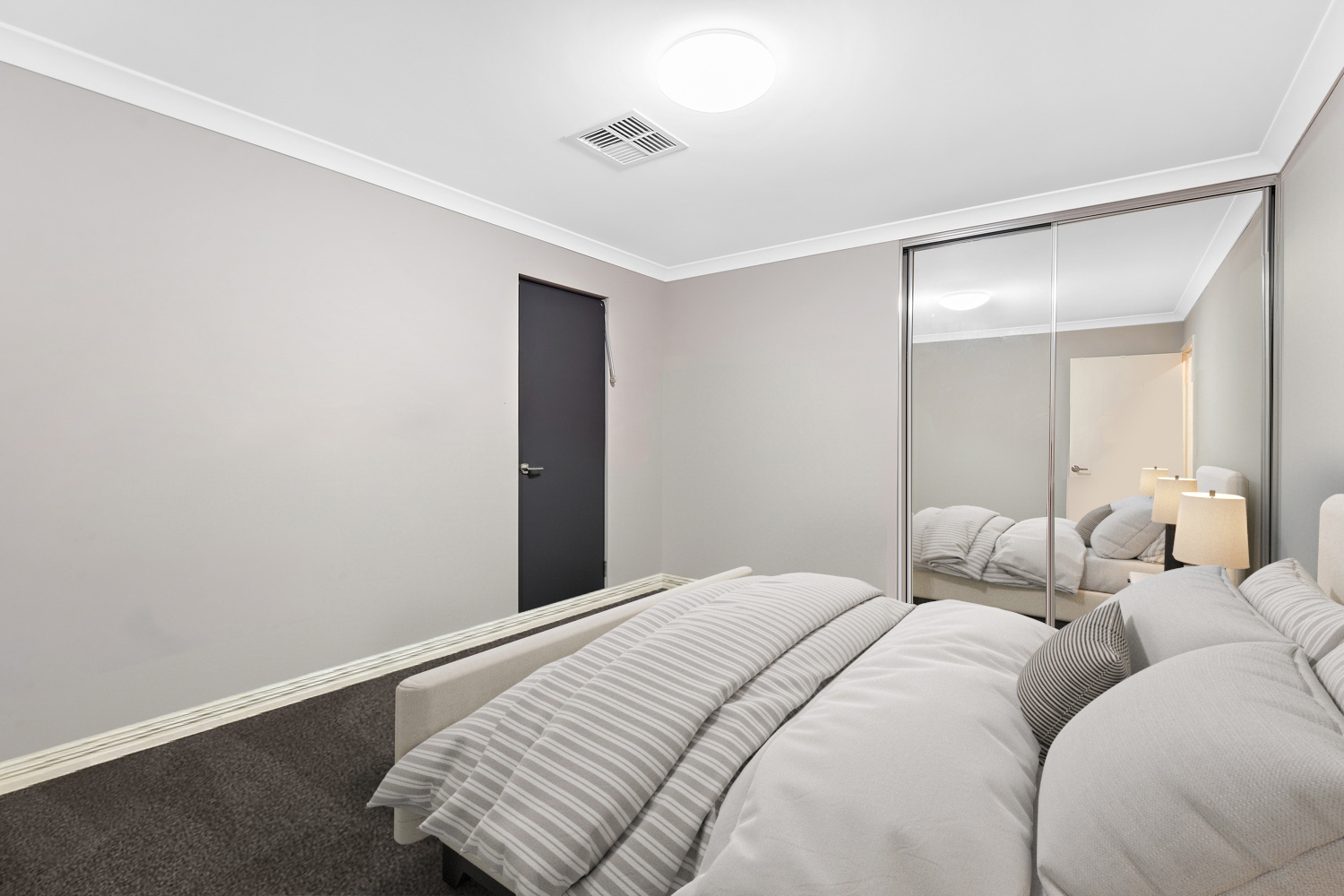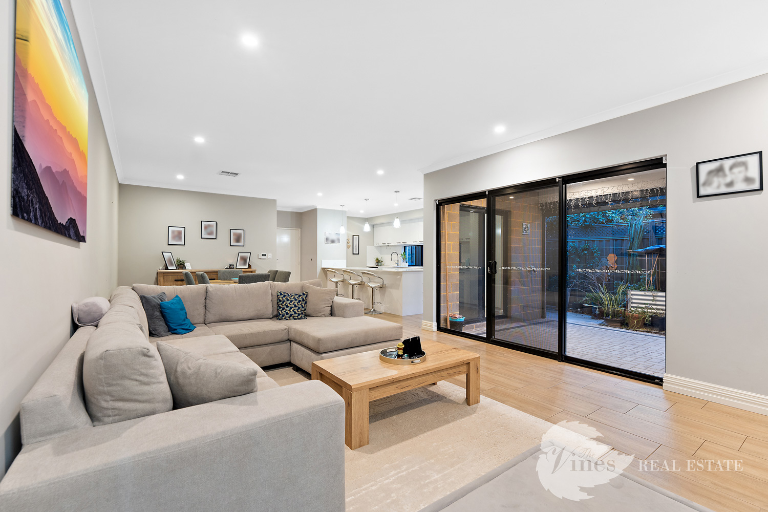 Step inside through the large entry door and you’ll be greeted with a sense of space, with raised ceilings, LED downlights and wood look tiles that flow through the main living areas, creating a warm yet contemporary atmosphere.