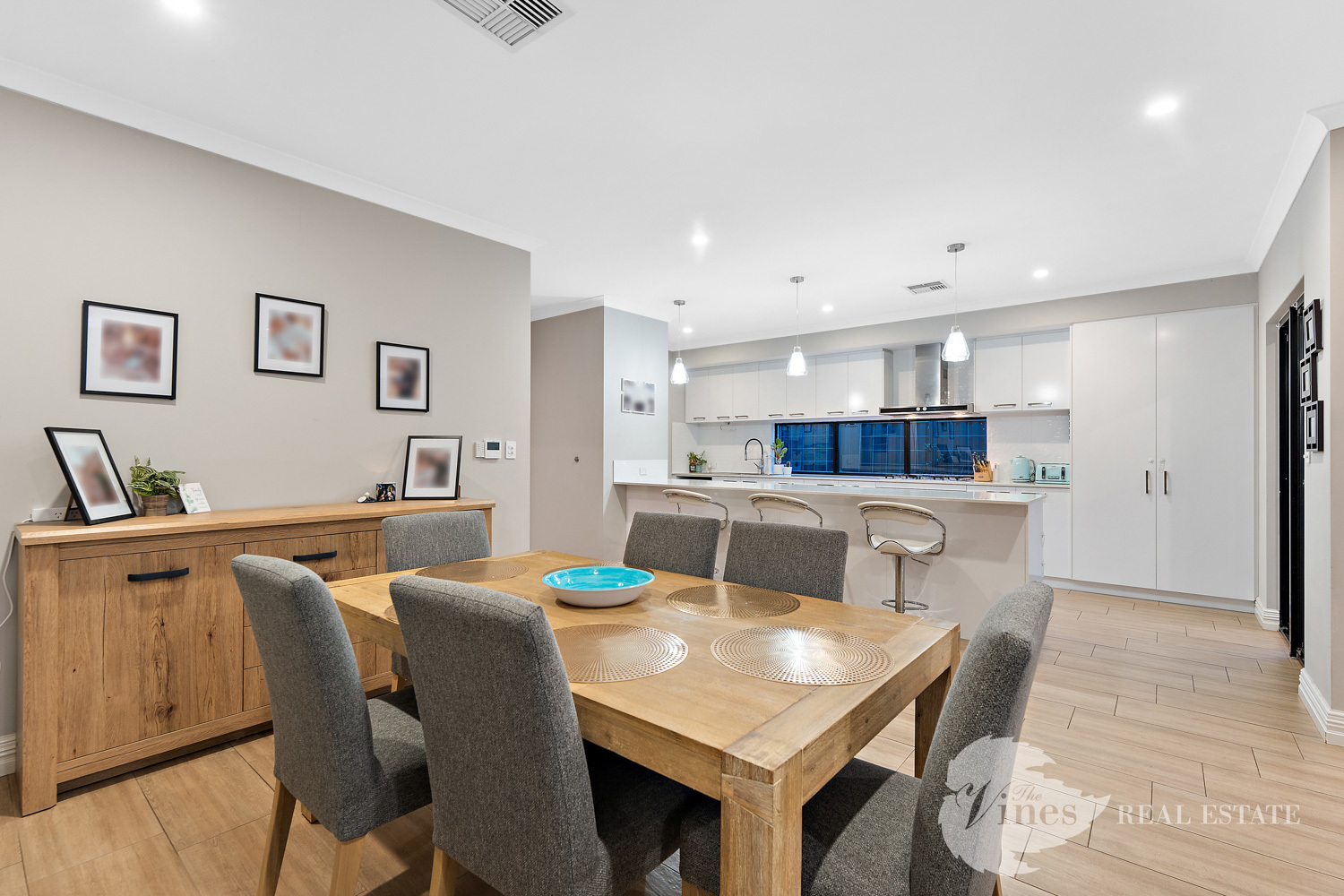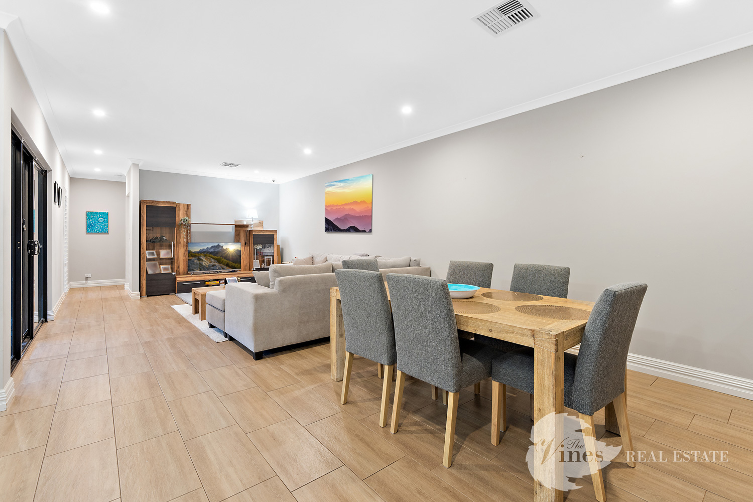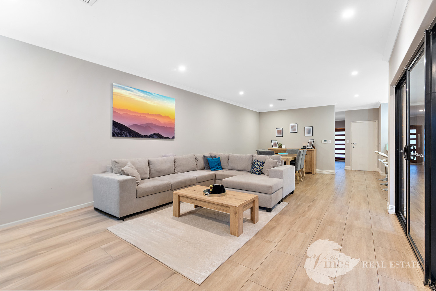 Step inside through the large entry door and you’ll be greeted with a sense of space, with raised ceilings, LED downlights and wood look tiles that flow through the main living areas, creating a warm yet contemporary atmosphere.