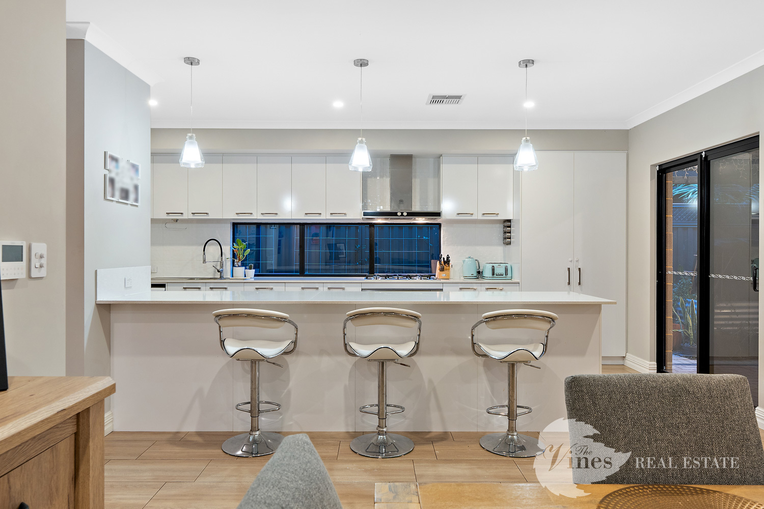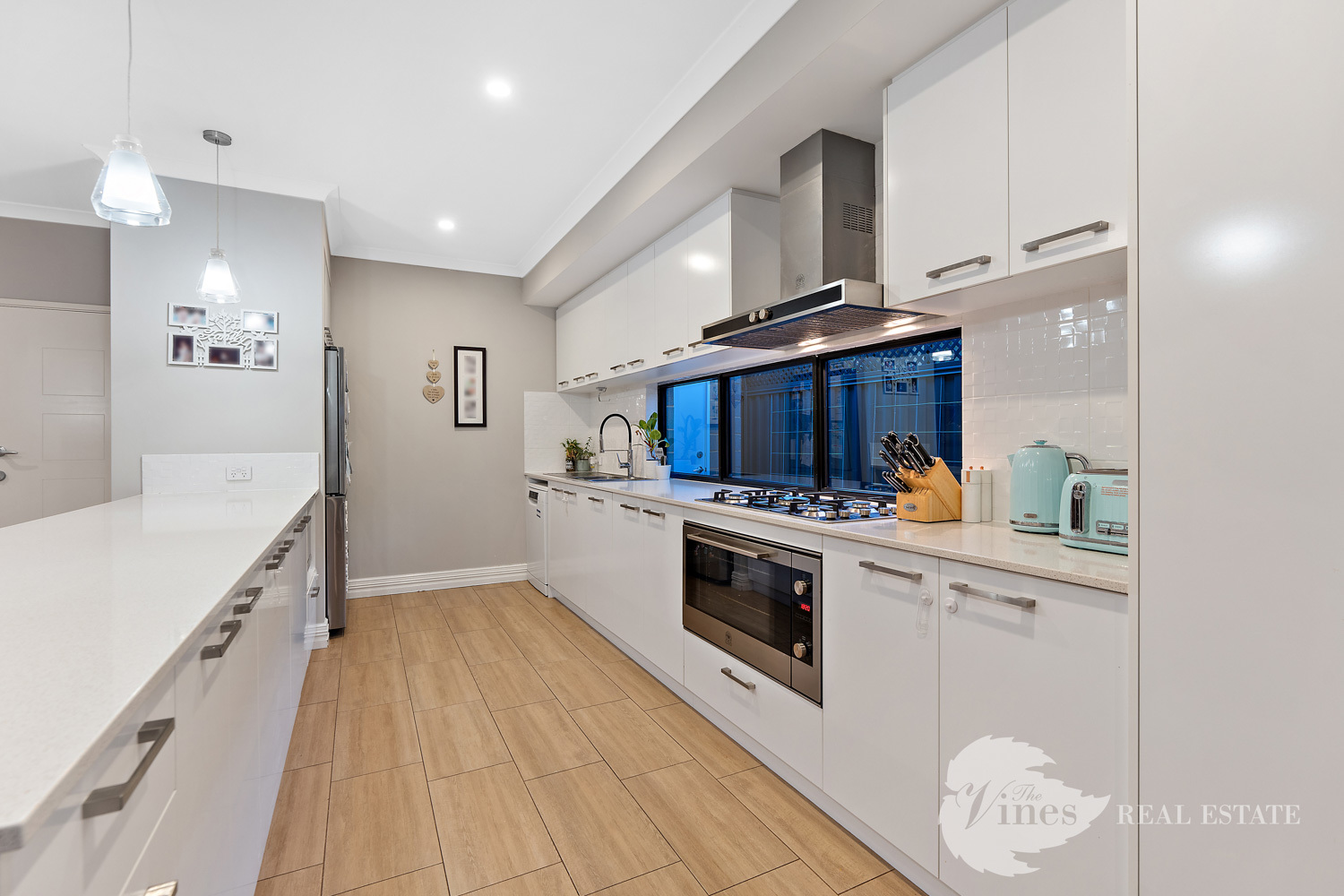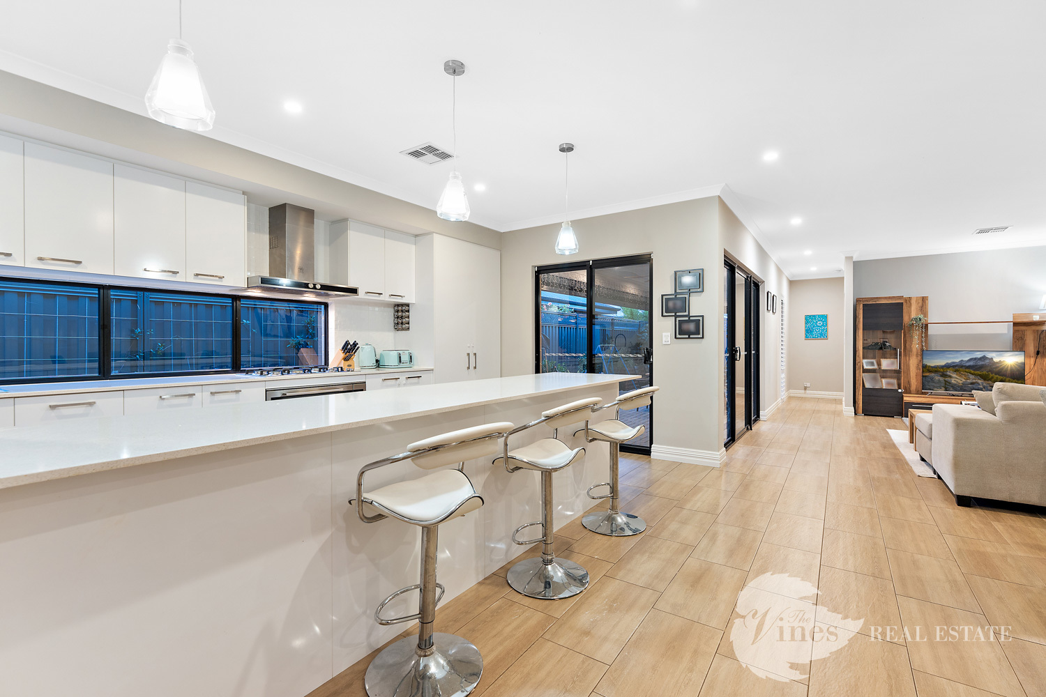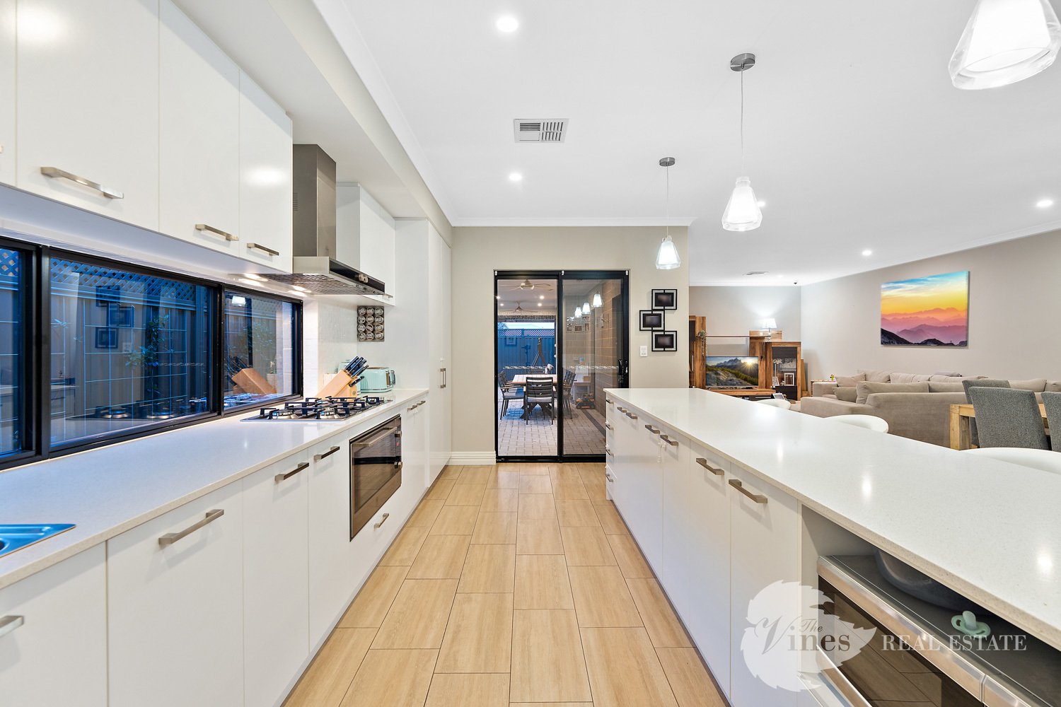 The open plan living and dining zone connects seamlessly to an impressive kitchen where every detail counts: sleek stone benchtops, pendant lighting, a 900mm gas cooktop and oven, double door fridge recess, feature window splashback, overhead cabinetry and a double pantry for those who love everything in its place.