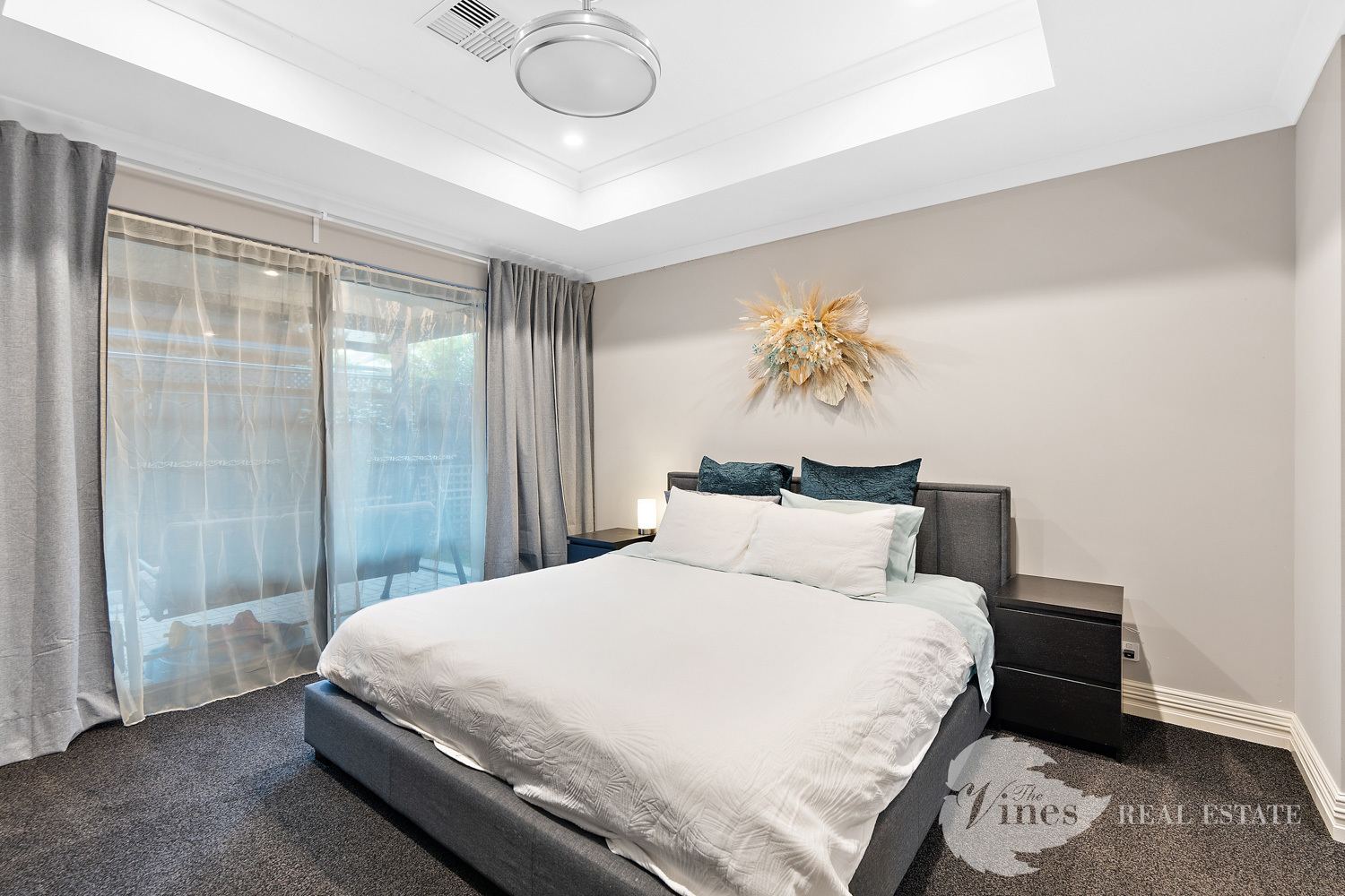 The master suite is a true statement, a private sanctuary featuring a stunning coffered ceiling, ceiling fan, built in make up and accessories station, a showstopping walk through robe and an elegant ensuite with dual sinks, plantation shutters and designer finishes. Sliding doors open directly to the alfresco, giving this space a resort-like feel – your own retreat to start or end the day in peace.
