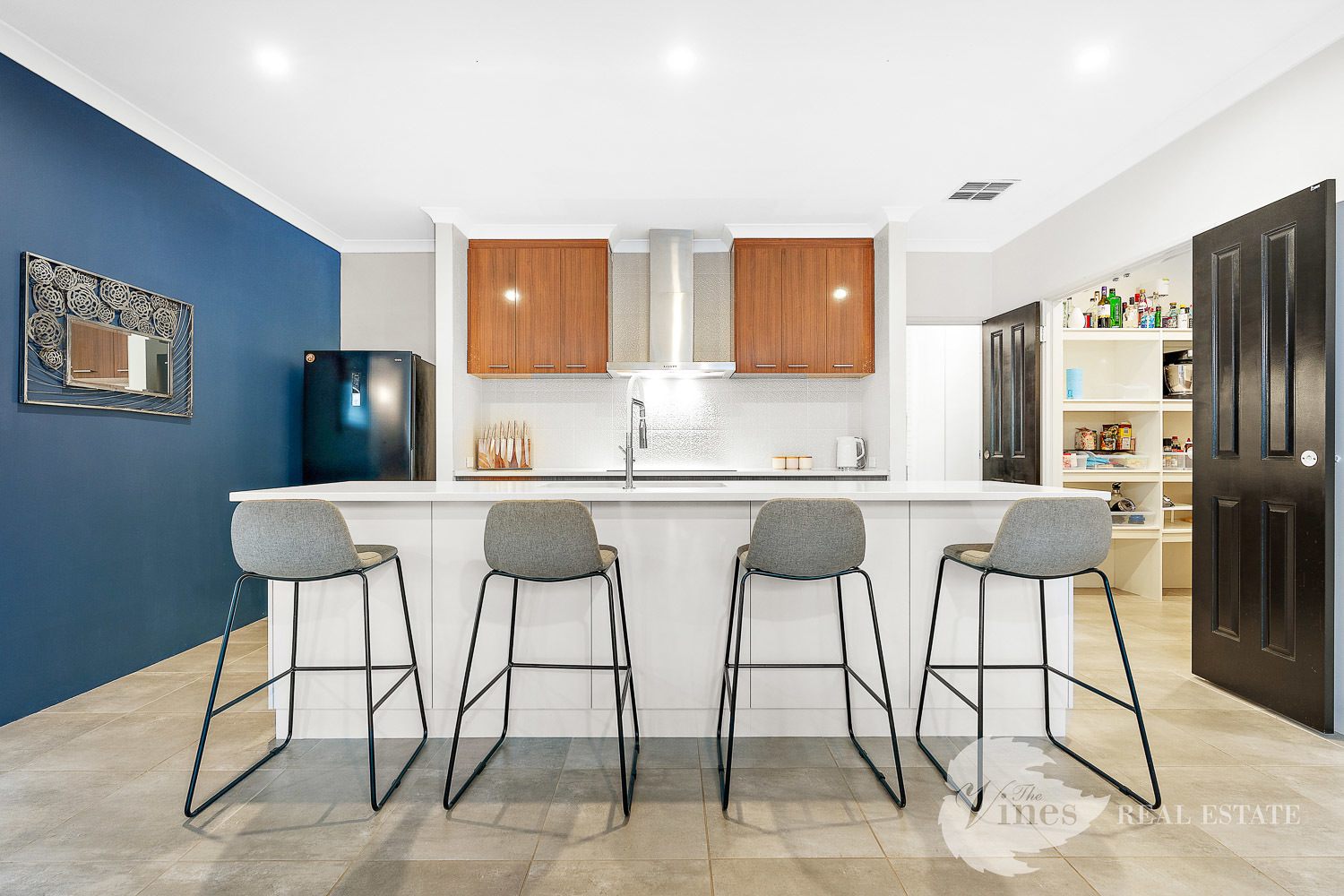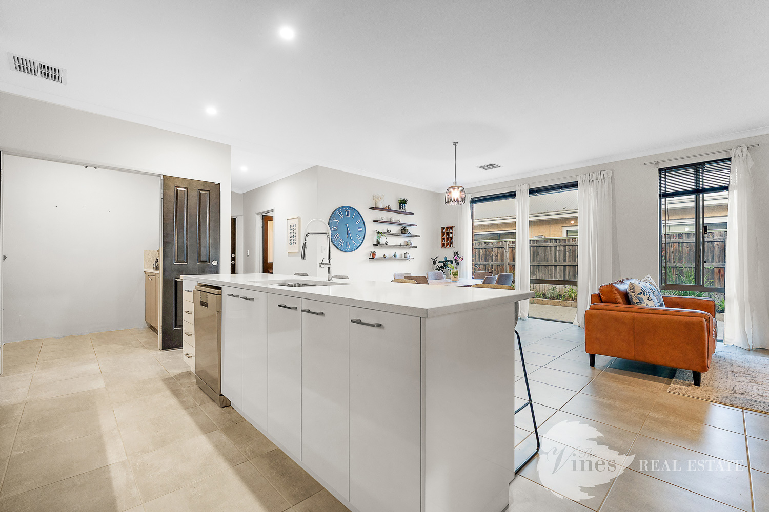 The wide hallway leads through to the heart of the home – the open-plan living, dining and kitchen space – where high ceilings and natural light create a sense of openness and calm. The kitchen is both stylish and practical, complete with a plumbed fridge recess, stone benchtops, an island bench, 900mm induction cooktop and oven, dishwasher, and a walk-in pantry with its own benchtop and power, making daily meal prep simple and organised. The laundry flows directly from the kitchen and features stone benchtops and full-height tiling.