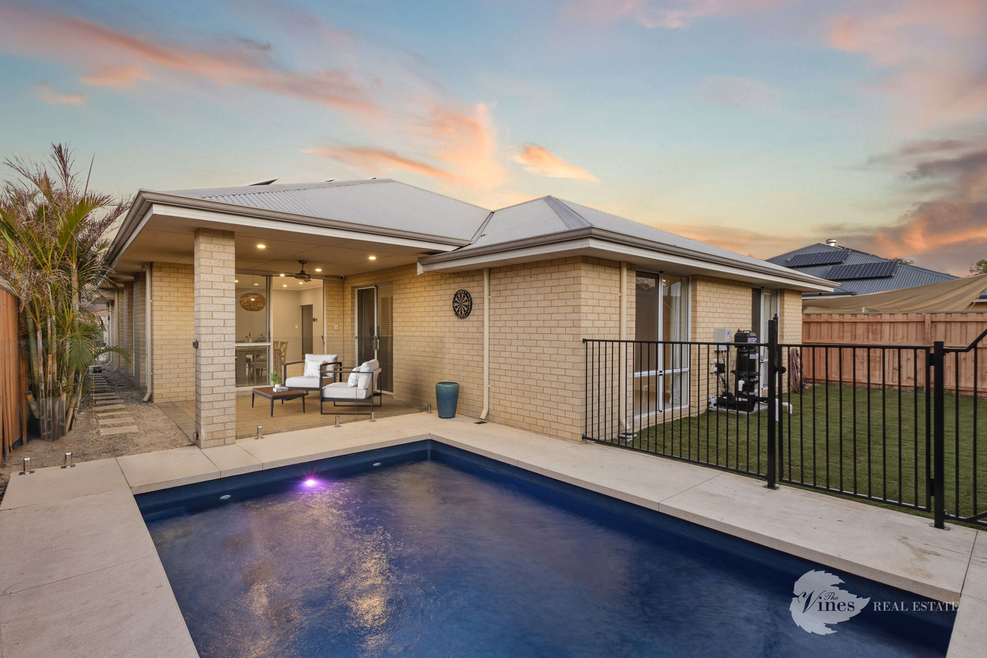 The communal areas flow seamlessly, with an open plan design that extends effortlessly to the alfresco entertaining space under the main roof. Whether hosting guests or unwinding with family, this home offers the perfect setting for every occasion. Outdoors, the golden cane palms provide a vibrant splash of greenery, complementing the home’s stylish colour palette. The front offers generous driveway space, while the backyard boasts a beautiful lawn for play, along with a serene pool area ideal for unwinding beneath the stars.