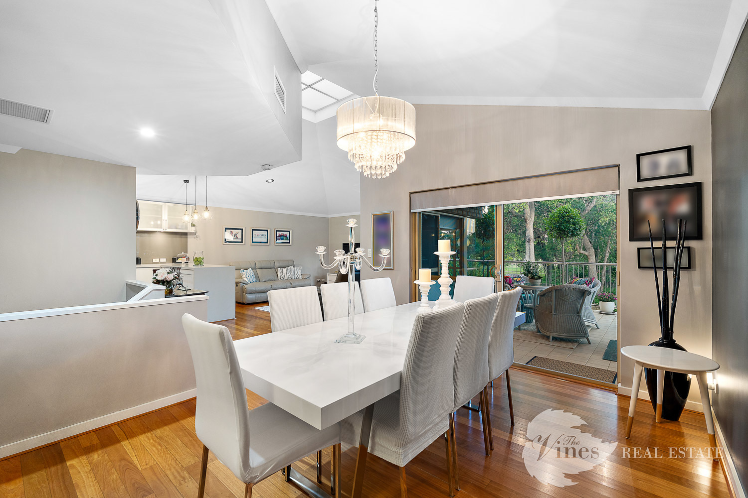 At the heart of the home, the stunning kitchen makes an immediate impression with its stone benchtops, dramatic waterfall edge, sleek glass splashback and generous overhead cabinetry. LED downlights illuminate the space beautifully, while the double fridge recess and thoughtful layout ensure everyday practicality matches the refined aesthetic. The adjoining dining area enjoys leafy outlooks, elevating even the simplest meal into an experience.