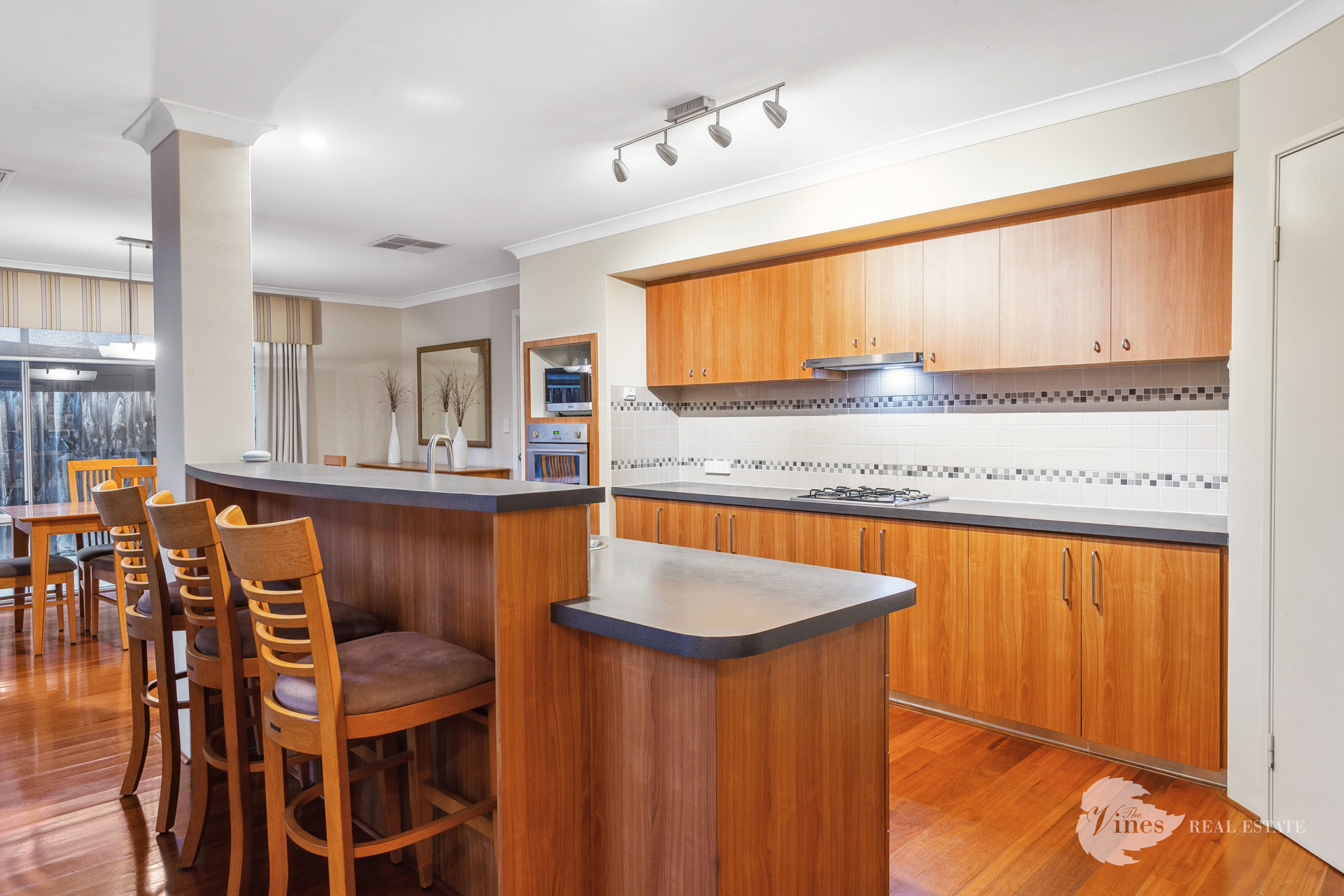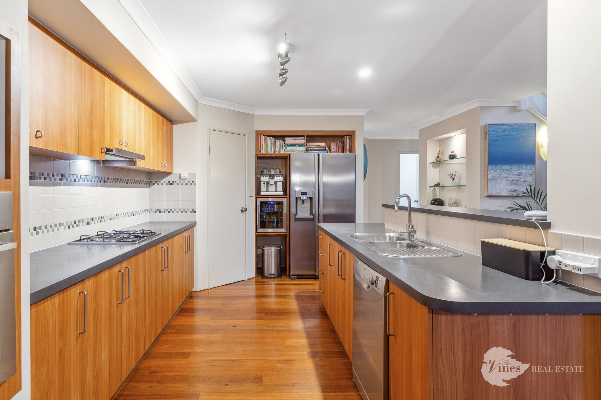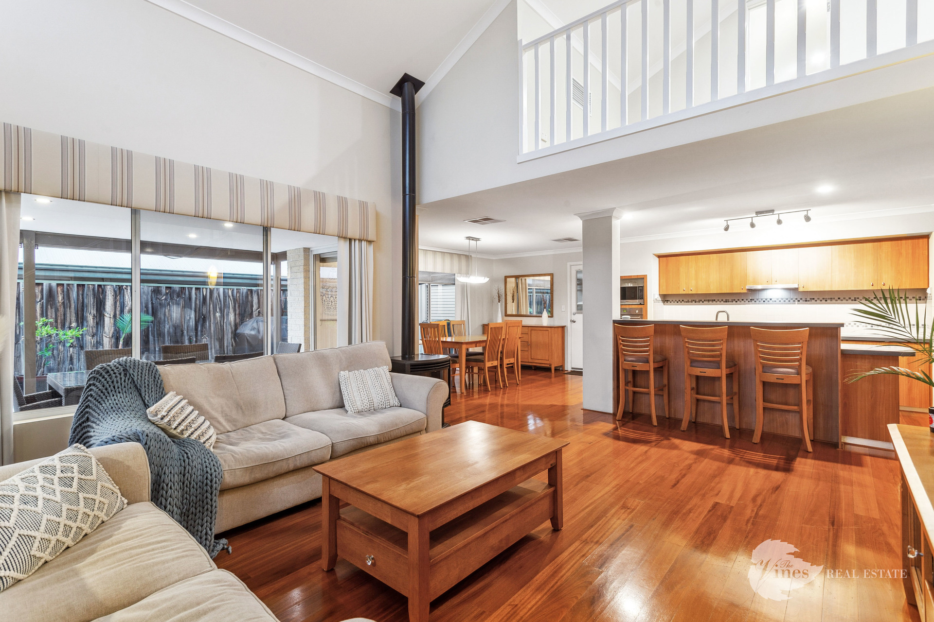 The heart of the home is the expansive open-plan living zone, showcasing a striking raked ceiling with an overhead void, a cozy gas fireplace, and serene views of the sparkling below ground pool. At the centre is a well appointed galley style kitchen featuring stainless steel appliances, a gas cooktop, wall oven, wine fridge, plumbed fridge recess, dishwasher, pantry, and abundant bench and storage space for all the family gatherings!