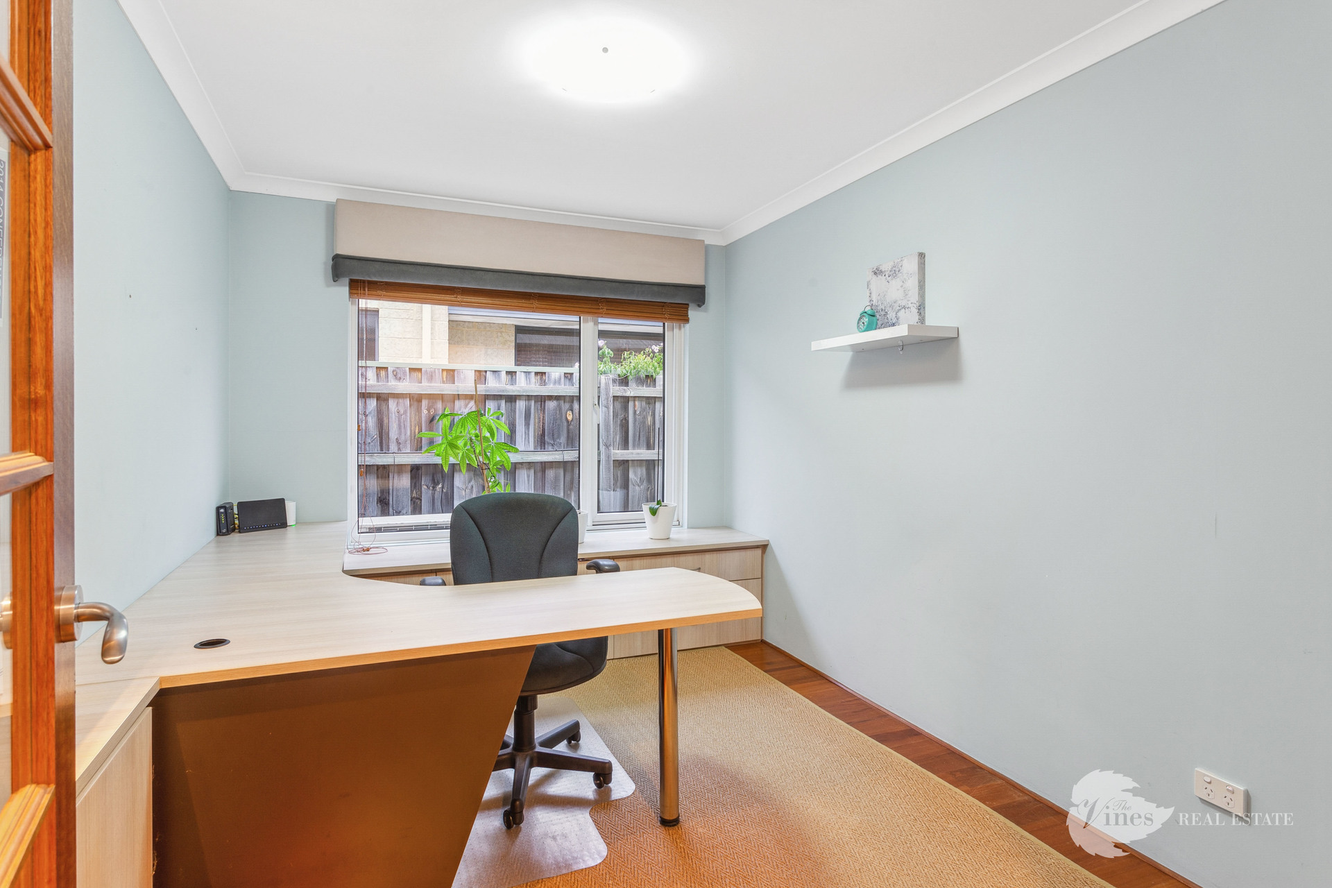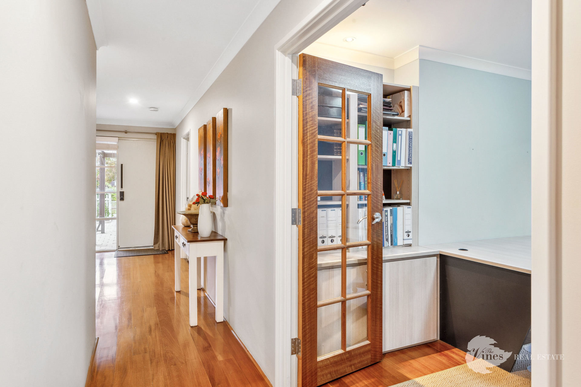 Movie nights will be a delight in the private theatre room, complete with custom built-in cabinetry and French doors. A separate study with a built-in desk and full cabinetry offers the perfect work-from-home setup.