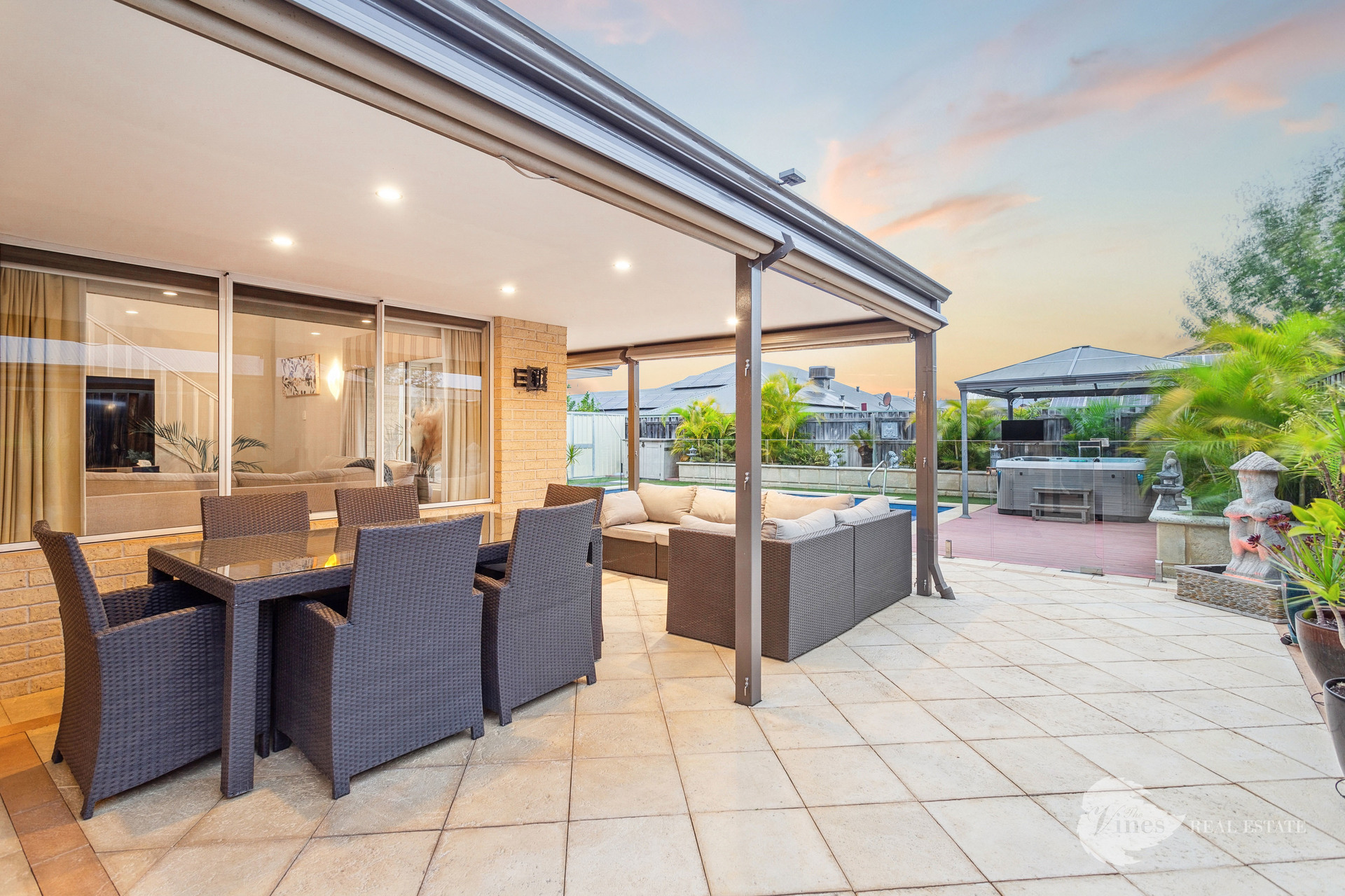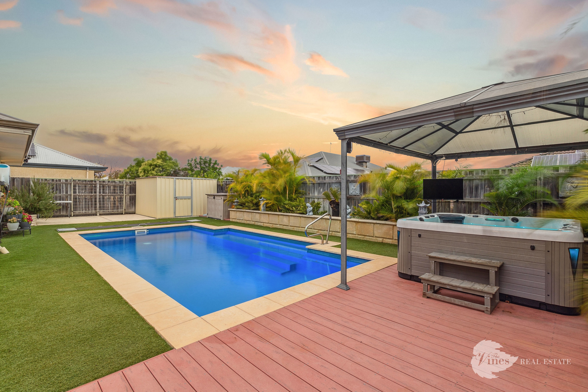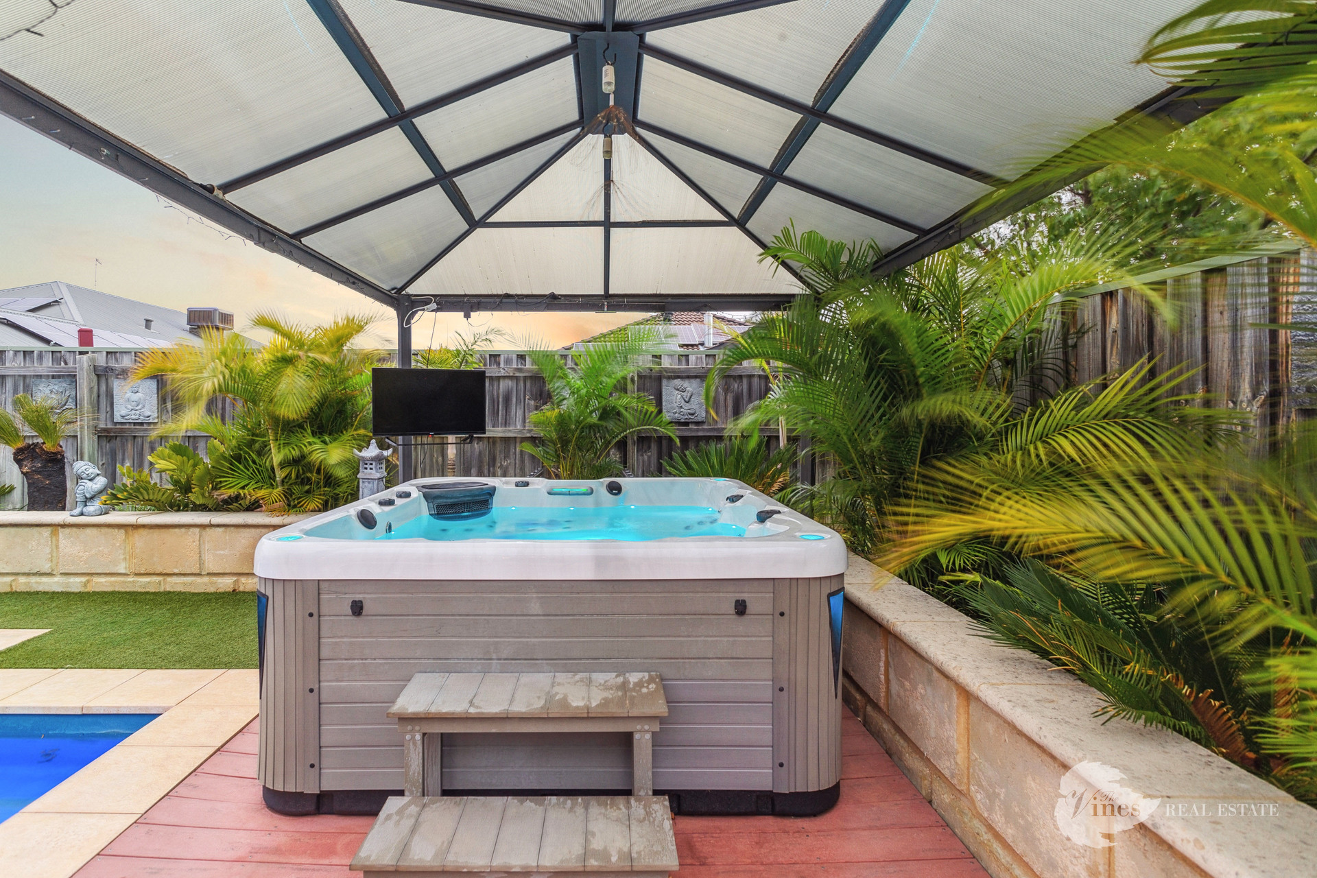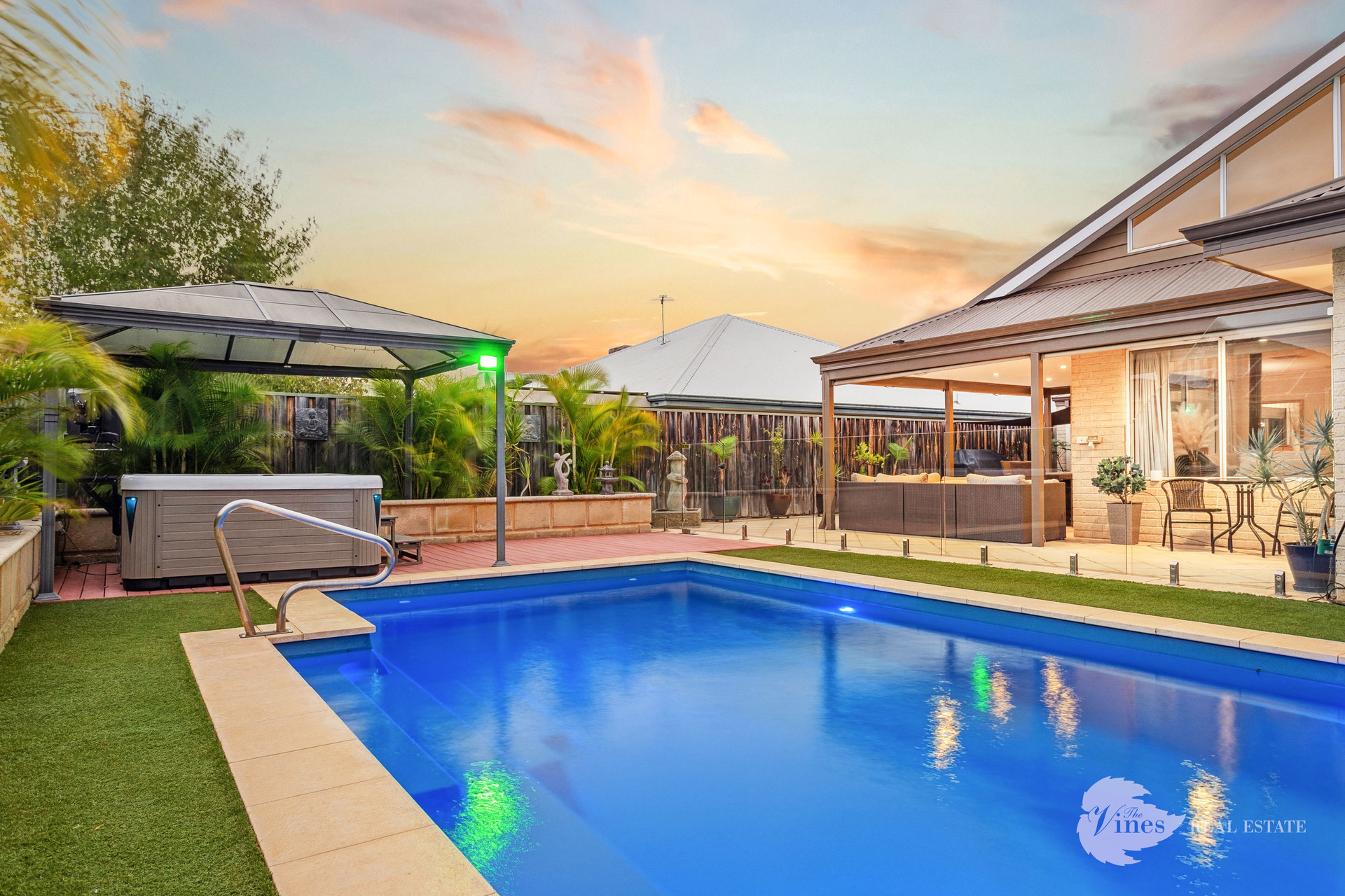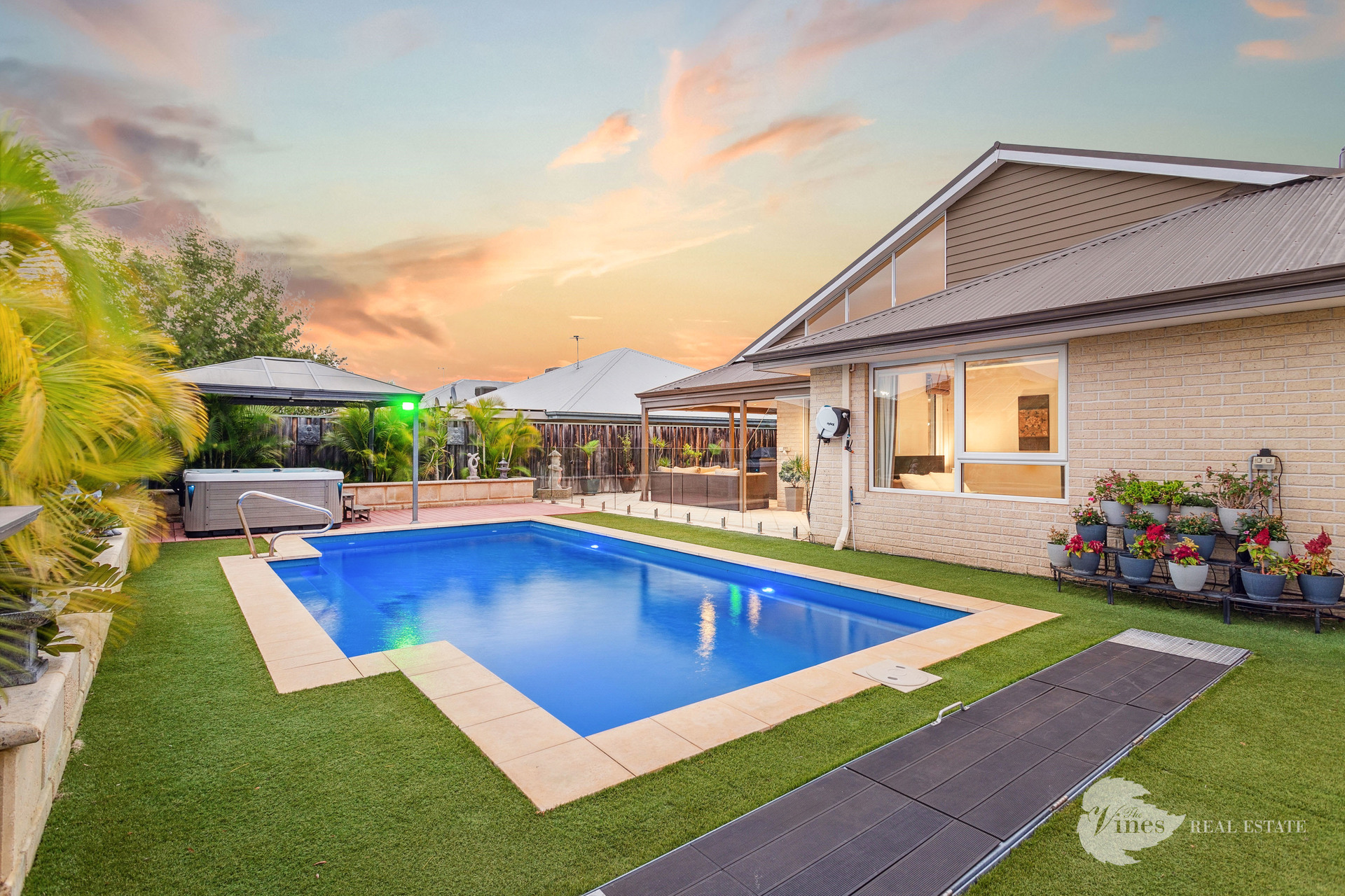 Outdoor entertaining is effortless with a fully equipped alfresco area, featuring café blinds, a lounge zone, and views across the glistening 4x11m heated pool with a retractable cover and separate spa. Surrounded by low-maintenance artificial lawn, lush tropical palms in raised limestone planters, and a sleek frameless glass fence, this backyard is your own private oasis.