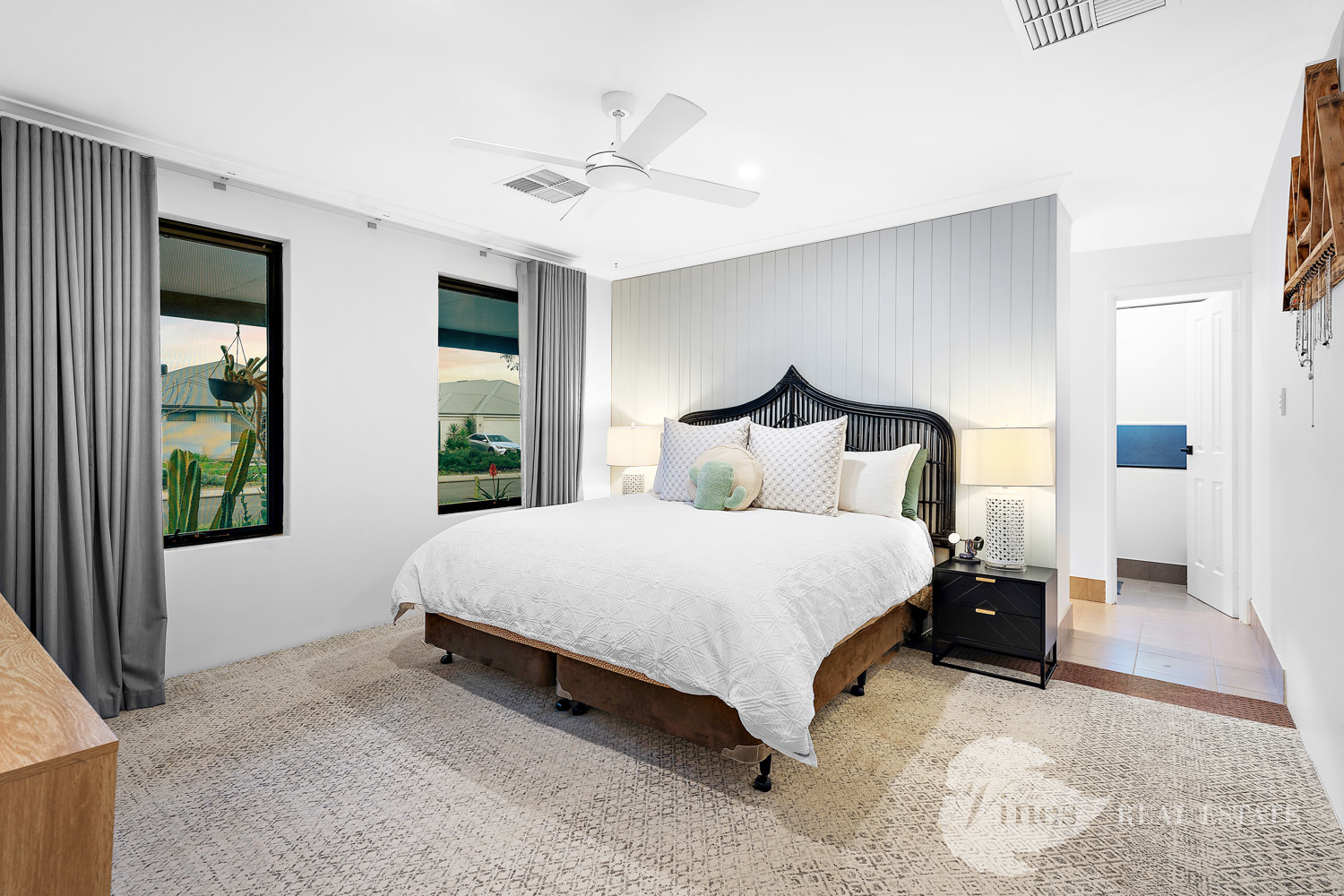 Step inside to discover four spacious bedrooms and two modern bathrooms, with the master suite offering a peaceful sanctuary complete with a walk-in robe and private ensuite. The three additional bedrooms each boast mirrored double door wardrobes, ceiling fans, roller blinds and curtains, providing comfort and practicality for growing families. A dedicated study tucked behind a striking barn door features built-in cabinetry and a desk – the ideal work-from-home or homework haven.