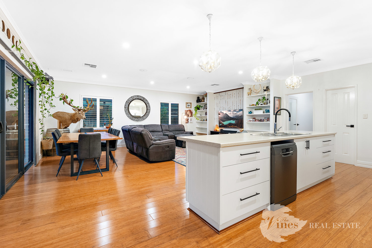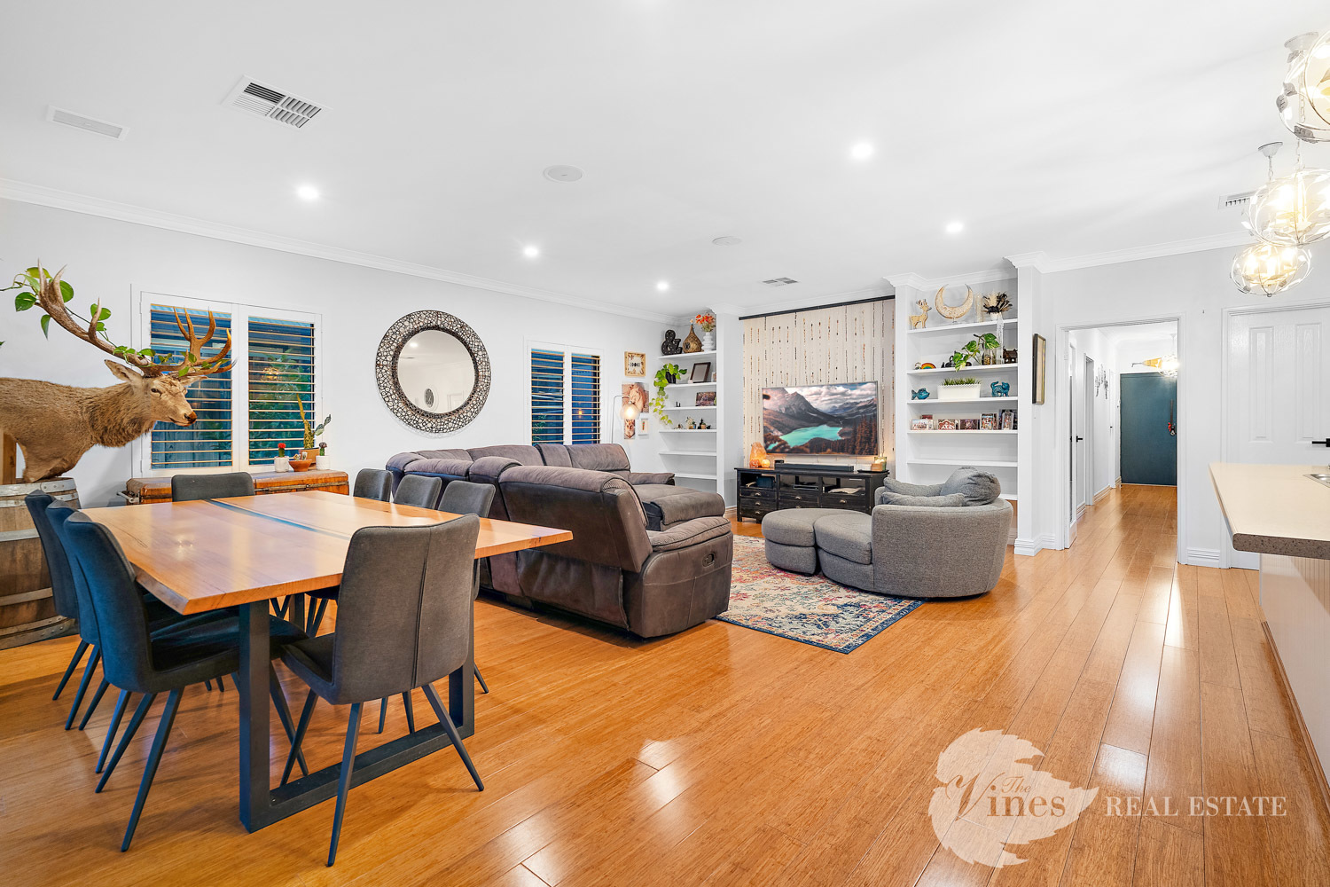 For those who love movie nights, the theatre room is ready to impress with its TV recess, while the expansive open plan living and dining zone offers another TV recess, built-in shelving for your favourite books and treasures, and an effortless connection to the heart of the home – the kitchen. Here, you’ll find an island bench perfect for entertaining, a generous walk-in pantry, loads of storage, and space for a double door fridge, all designed to make everyday living a breeze.