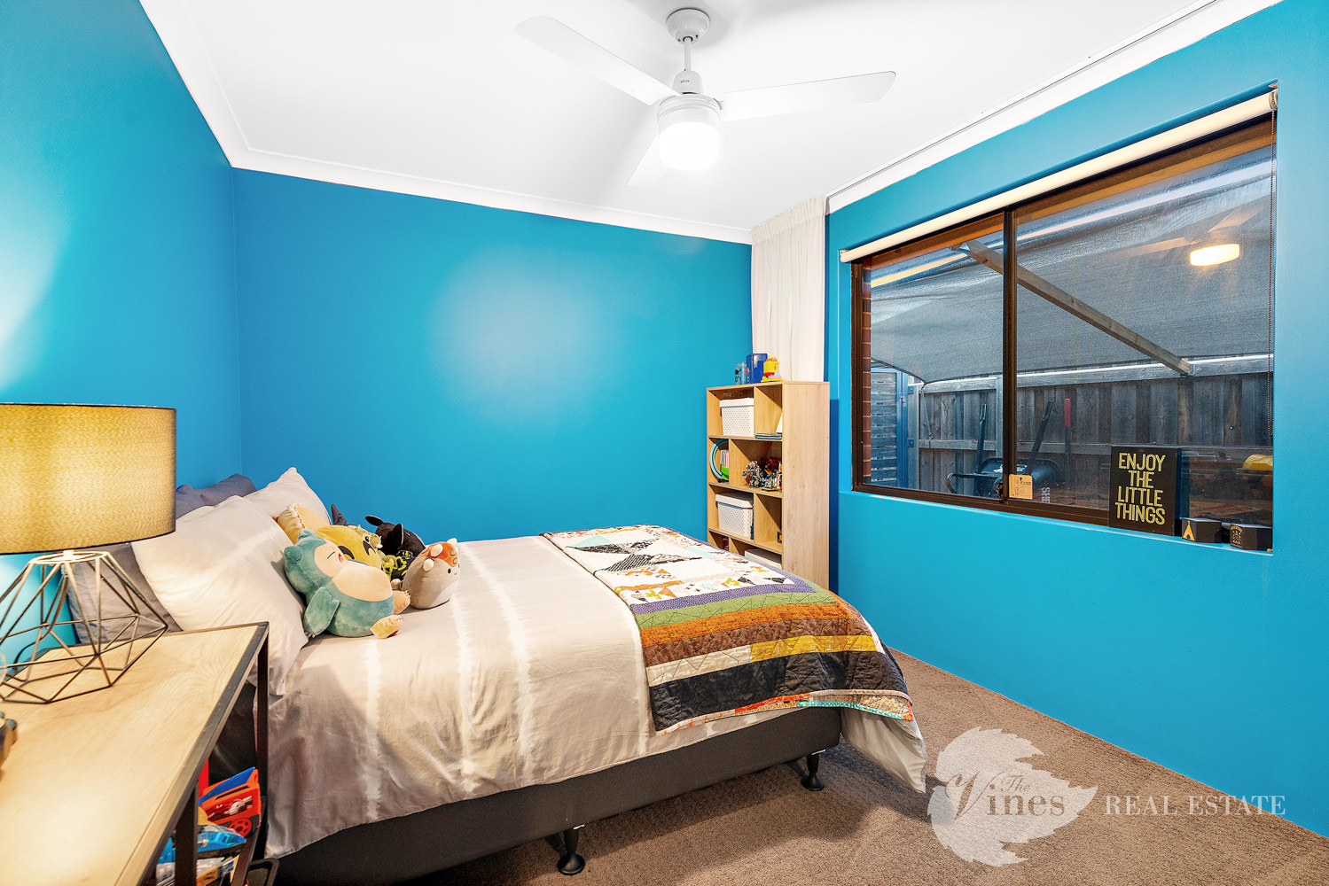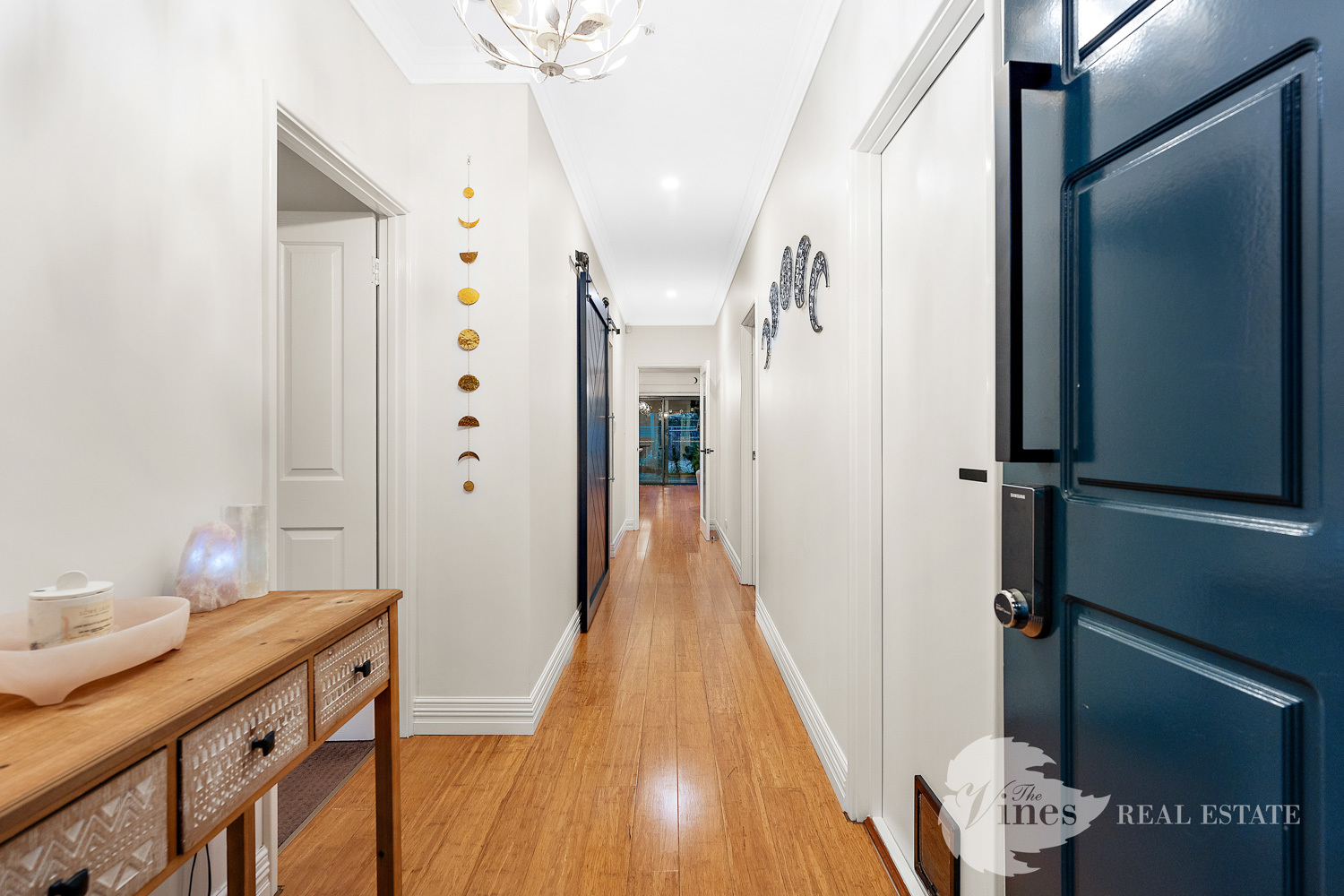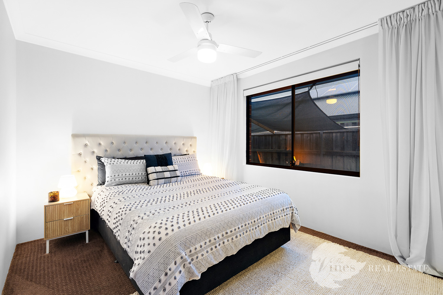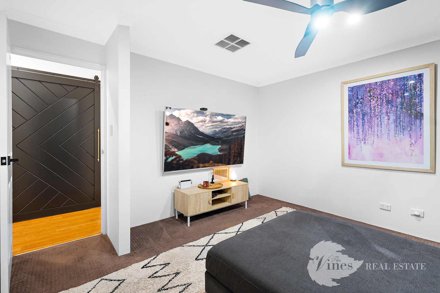 Step inside to discover four spacious bedrooms and two modern bathrooms, with the master suite offering a peaceful sanctuary complete with a walk-in robe and private ensuite. The three additional bedrooms each boast mirrored double door wardrobes, ceiling fans, roller blinds and curtains, providing comfort and practicality for growing families. A dedicated study tucked behind a striking barn door features built-in cabinetry and a desk – the ideal work-from-home or homework haven.