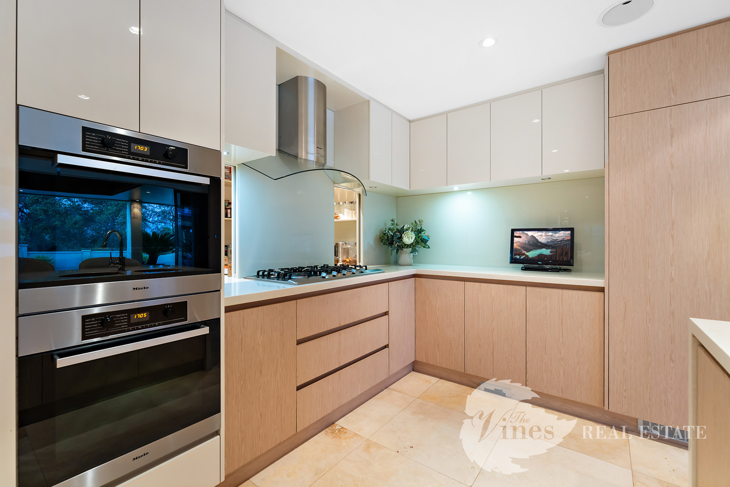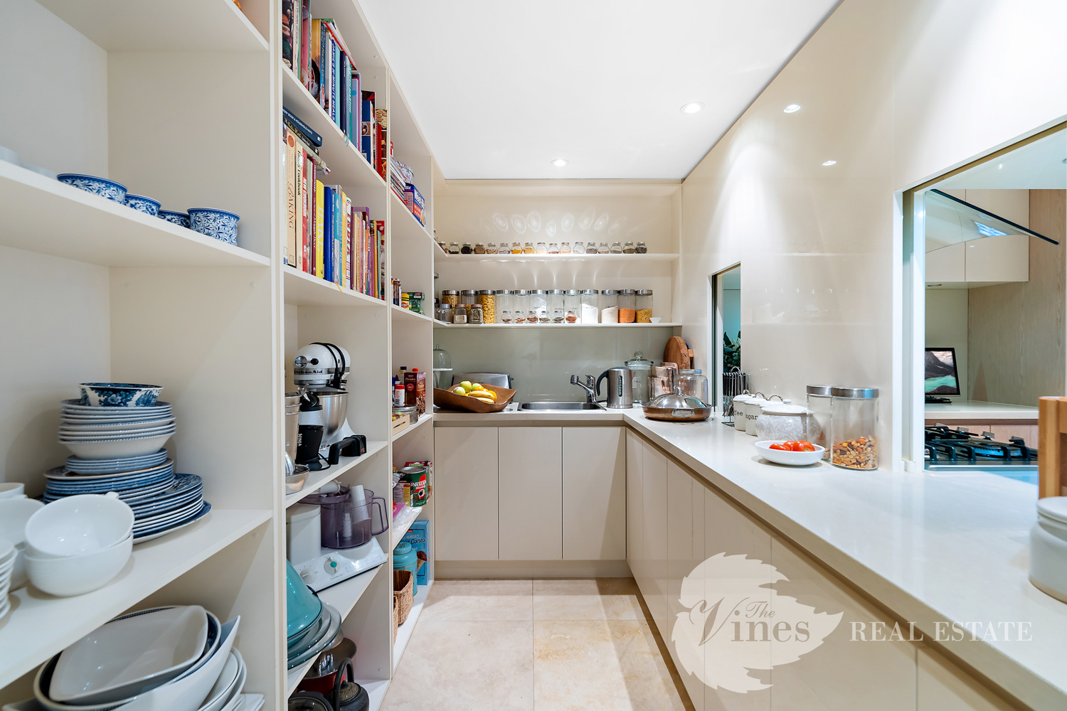 At the heart of the residence, the formal dining room is framed by limestone columns and opens effortlessly through dual stacker doors to a vast alfresco entertaining terrace. The adjoining kitchen is a culinary showpiece, equipped with Liebherr refrigeration, twin Miele ovens, gas cooktop, integrated coffee machine, microwave, dishwasher, and a scullery with ample storage and pass through windows.