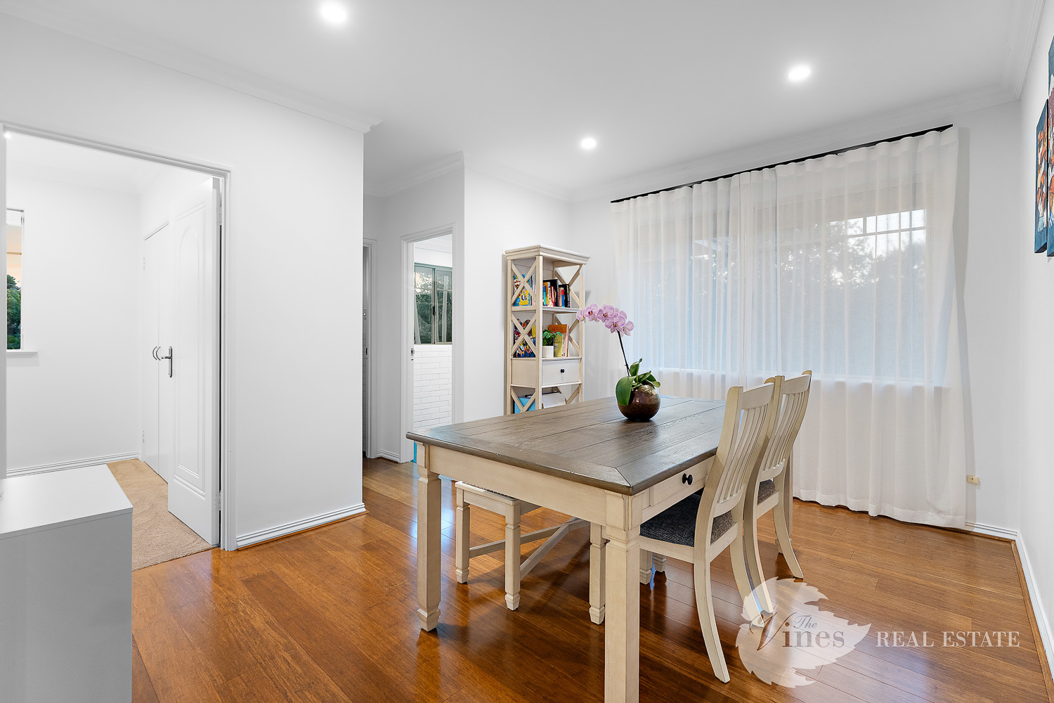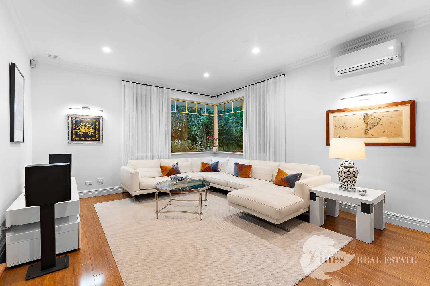 To the left, a refined lounge is bathed in filtered light through soft sheers adorning the large corner window, with tranquil views extending beyond to the front garden. The elegant dining room opens through sliding glass doors to its own charming portico, creating an ideal setting for after-dinner drinks or morning coffee, while a private study to the right of the entry provides a peaceful home office with calming garden outlooks.