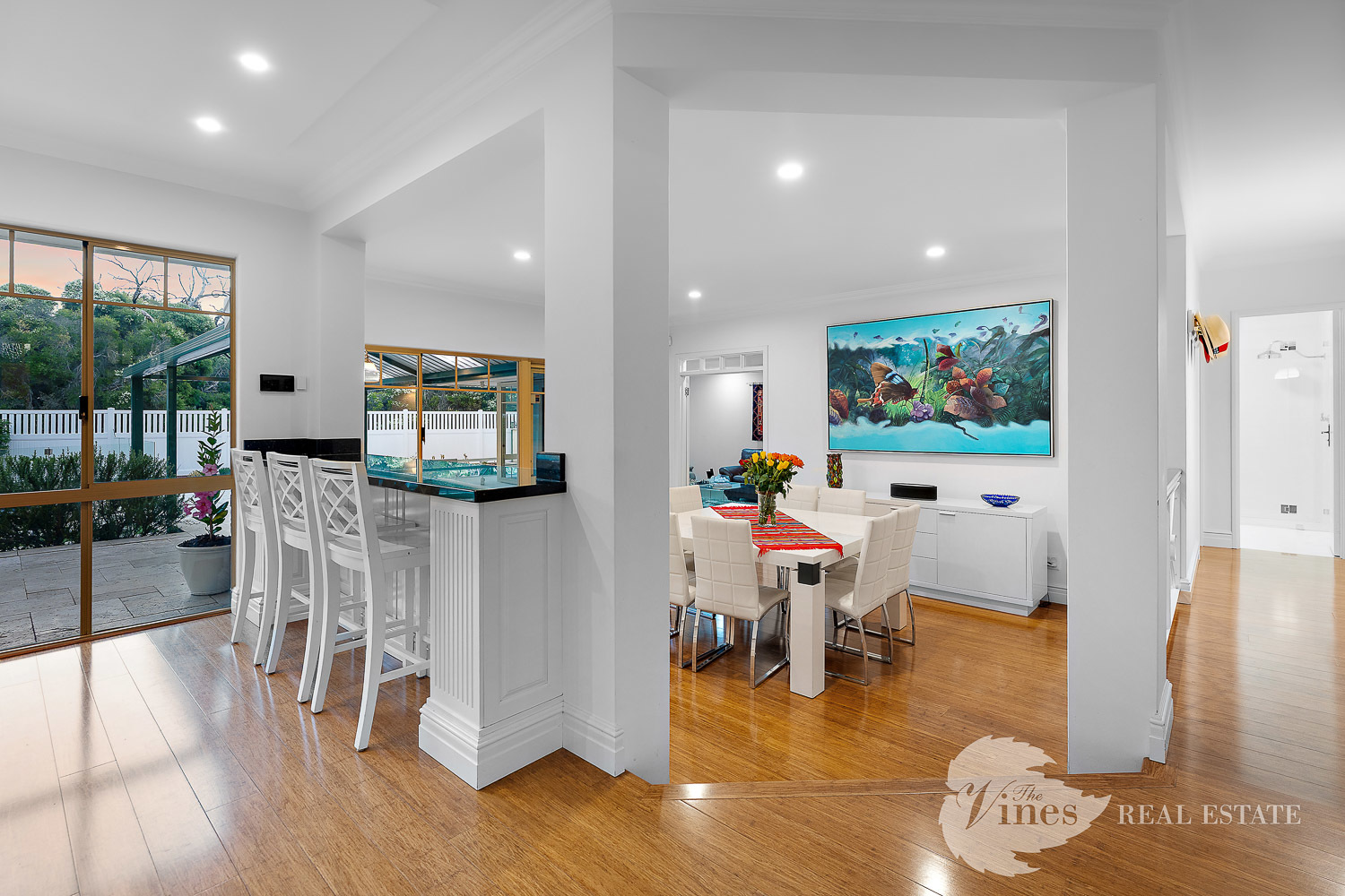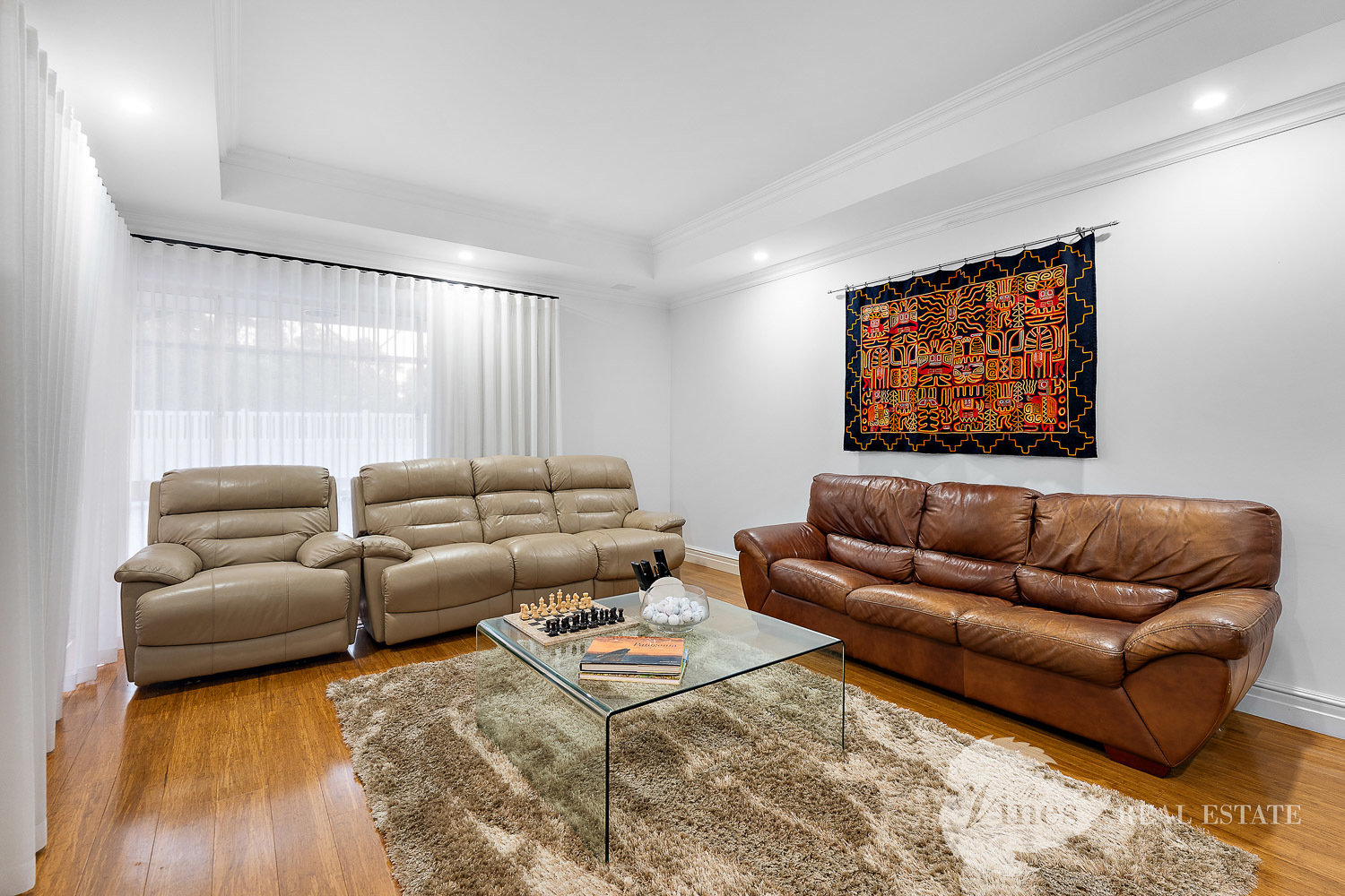 The family room seamlessly connects to the outdoors through glass sliding doors, while double French doors lead into a versatile multi-purpose room, perfect as a home theatre, games room or additional lounge, complete with recessed ceiling and direct access to the alfresco and pool area.