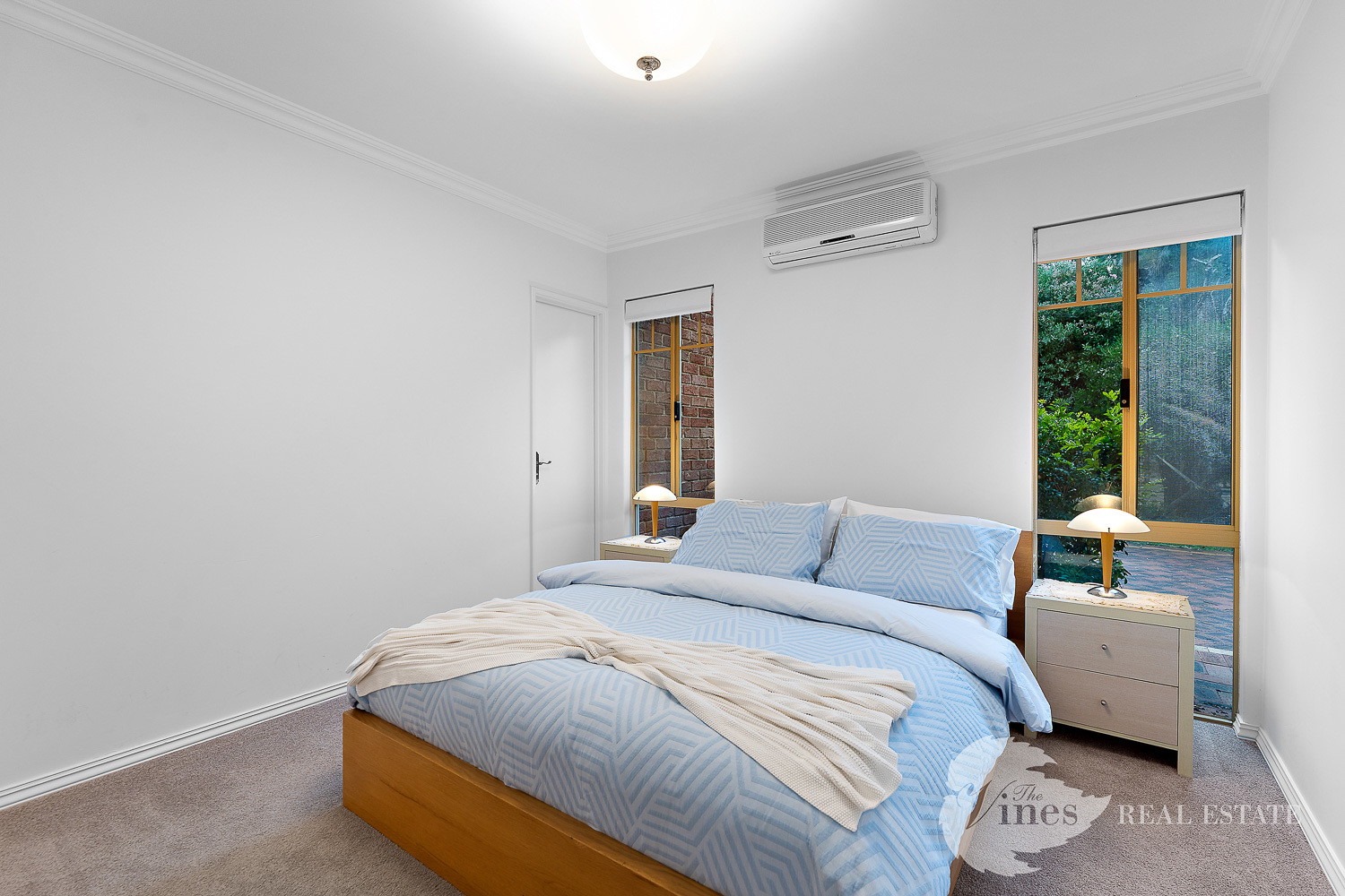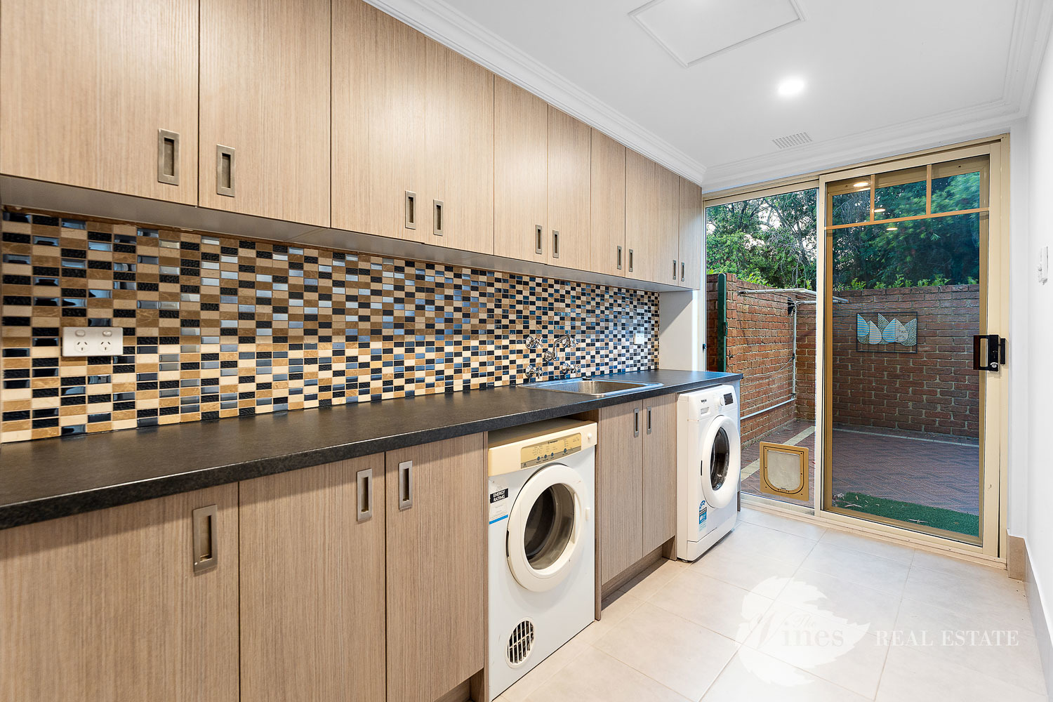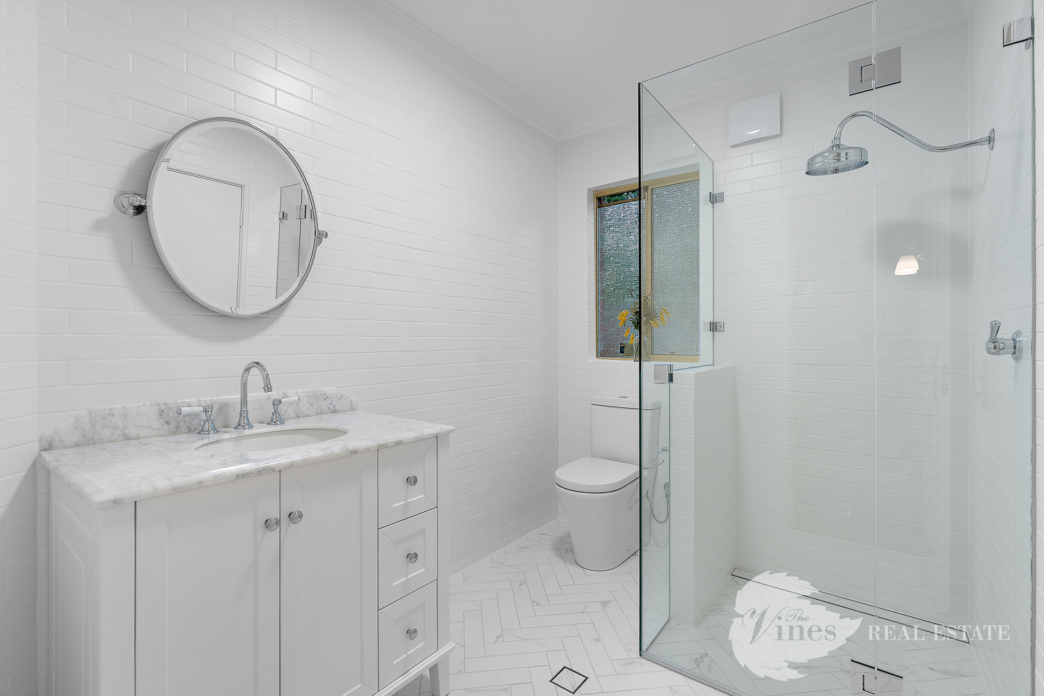 A private guest bedroom with built-in robe is thoughtfully positioned with access to a fully renovated second bathroom showcasing frameless shower, stone-topped vanity, toilet and striking herringbone feature tiling. The spacious laundry continues the home’s emphasis on practicality with extensive storage, and direct access to a secluded outdoor drying area.