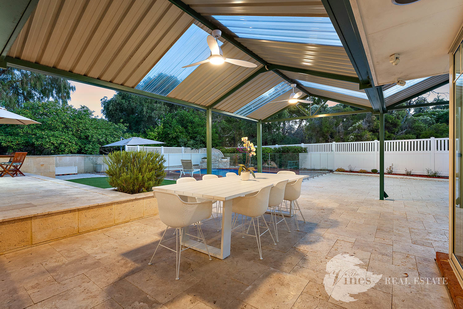 Outdoors, travertine paving defines the expansive alfresco entertaining area, crowned with twin pitched roofs and enhanced by ceiling fans and integrated Sonos ceiling speakers, making it ideal for hosting gatherings of any size. Frameless glass fencing surrounds the shimmering concrete salt-water pool, complete with a striking stone clad water blade for a resort-style atmosphere.