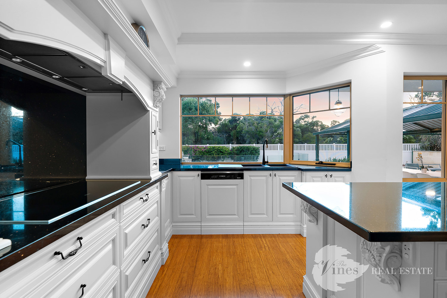 At the heart of the home, the enormous open plan living and kitchen domain is both breathtaking and highly functional, evoking the warmth and sophistication of a country estate. Bespoke, handmade cabinetry offers exceptional storage, complemented by soft-closing drawers and cupboards, feature display cabinetry, appliance storage, a large pantry and expansive granite benchtops that extend to a substantial centre island and breakfast bar. Premium Miele appliances, including oven, induction cooktop with concealed range hood, microwave and integrated dishwasher, complete this exceptional culinary space. Large windows frame picturesque garden, pool and nature views beyond.