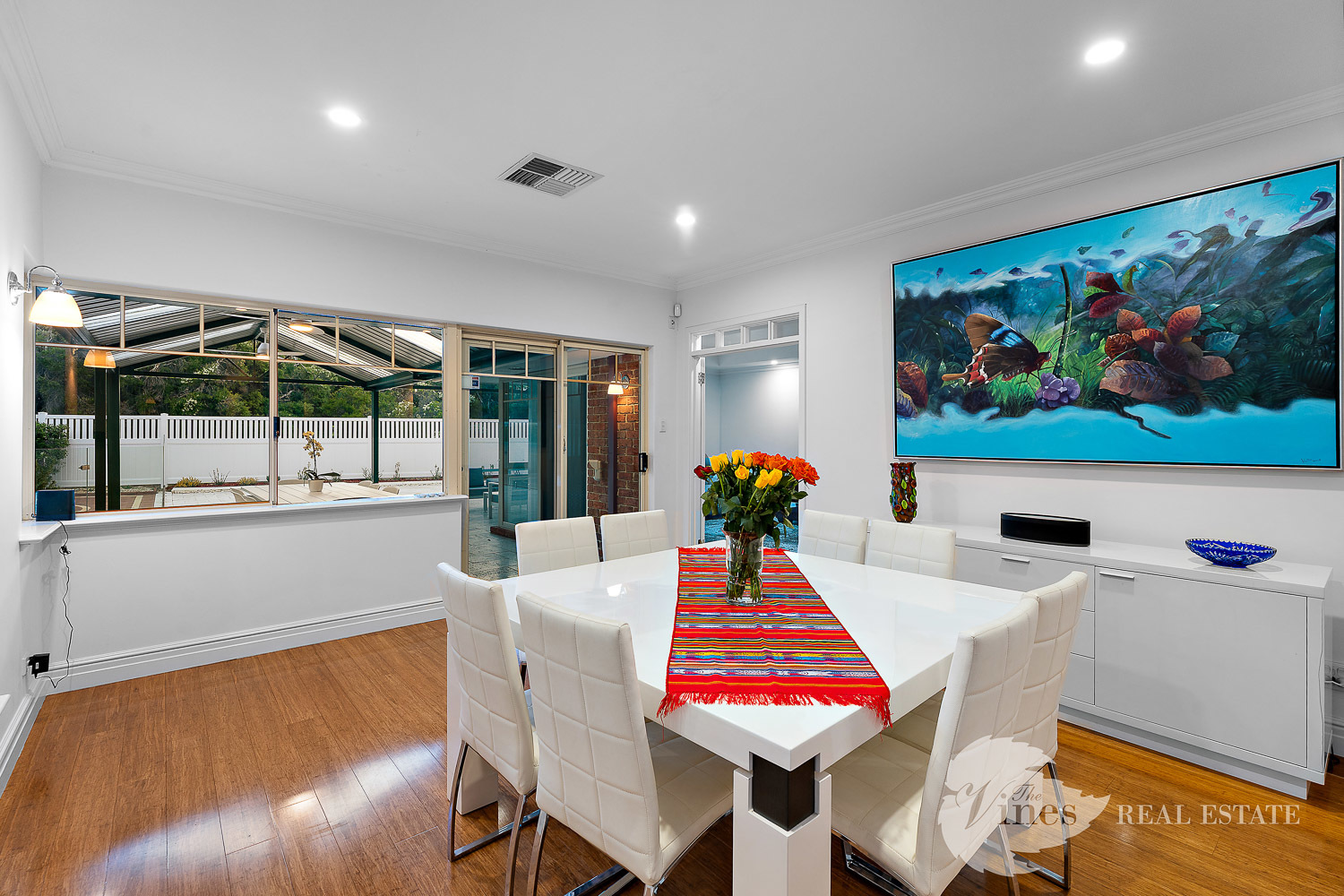 Enhanced by high ceilings, LED downlighting, elegant sheers that soften each space, a central wood fire, reverse-cycle air conditioning, a Sonos sound system, security screens, bore-fed reticulation, a bio-cycle septic system and extensive parking, this is a residence of exceptional comfort and security.