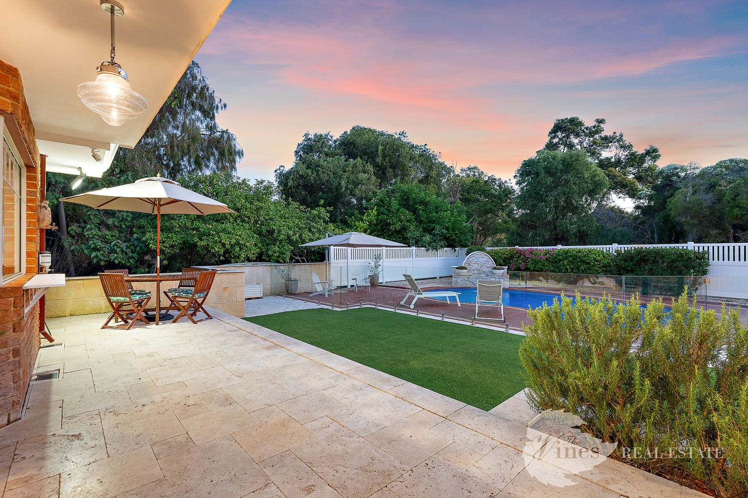 Outdoors, travertine paving defines the expansive alfresco entertaining area, crowned with twin pitched roofs and enhanced by ceiling fans and integrated Sonos ceiling speakers, making it ideal for hosting gatherings of any size. Frameless glass fencing surrounds the shimmering concrete salt-water pool, complete with a striking stone clad water blade for a resort-style atmosphere.