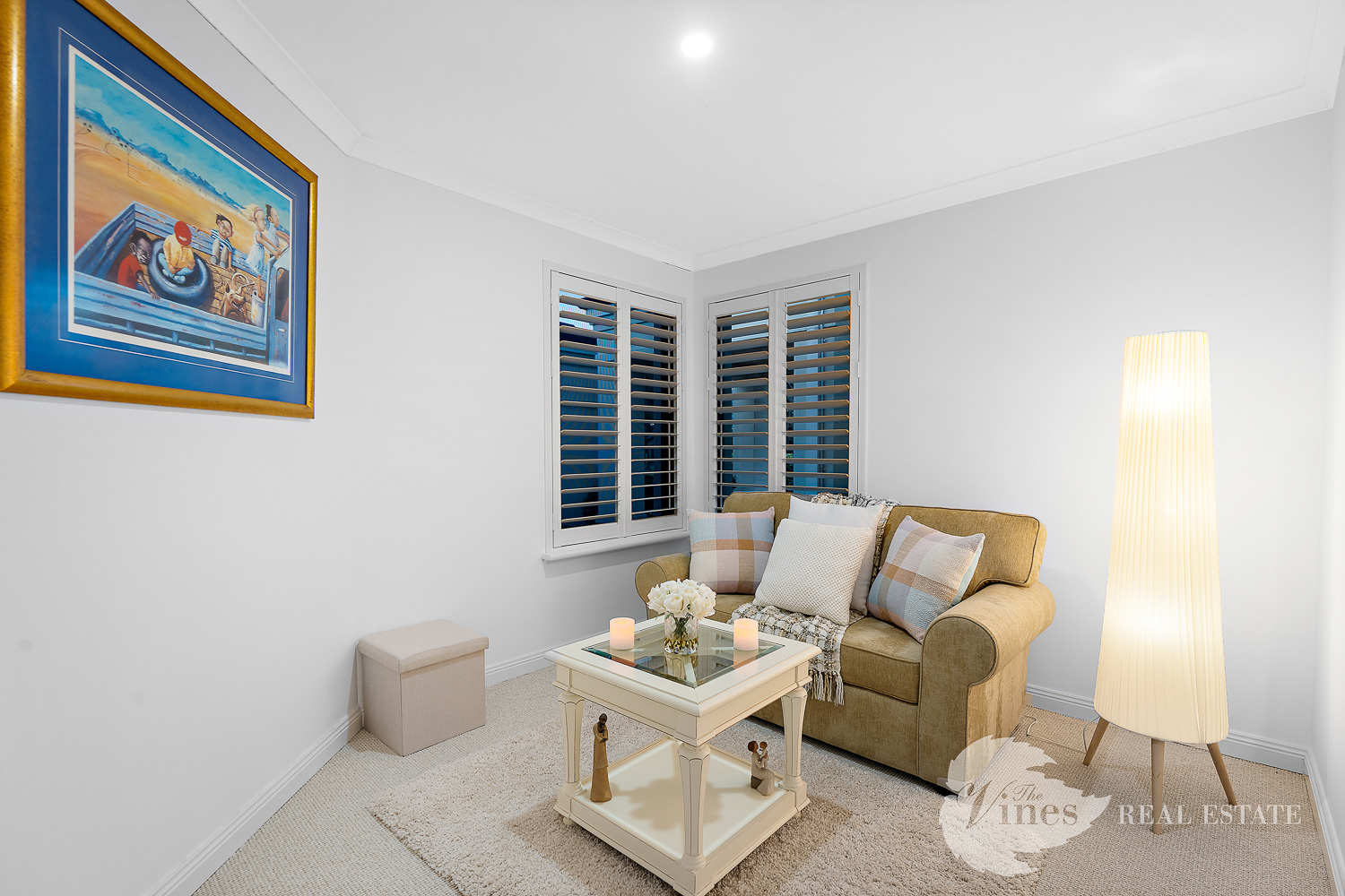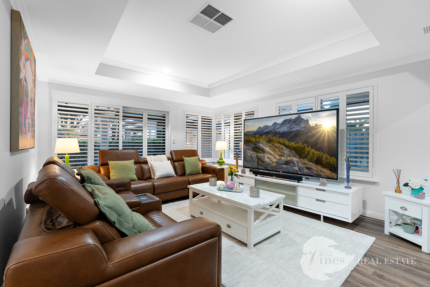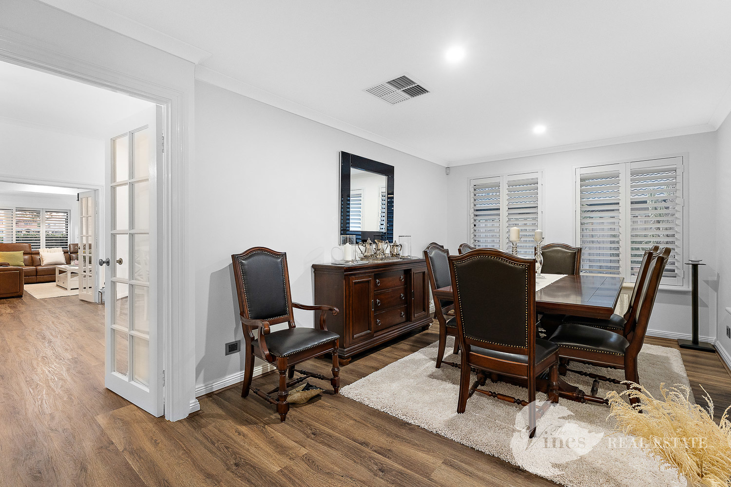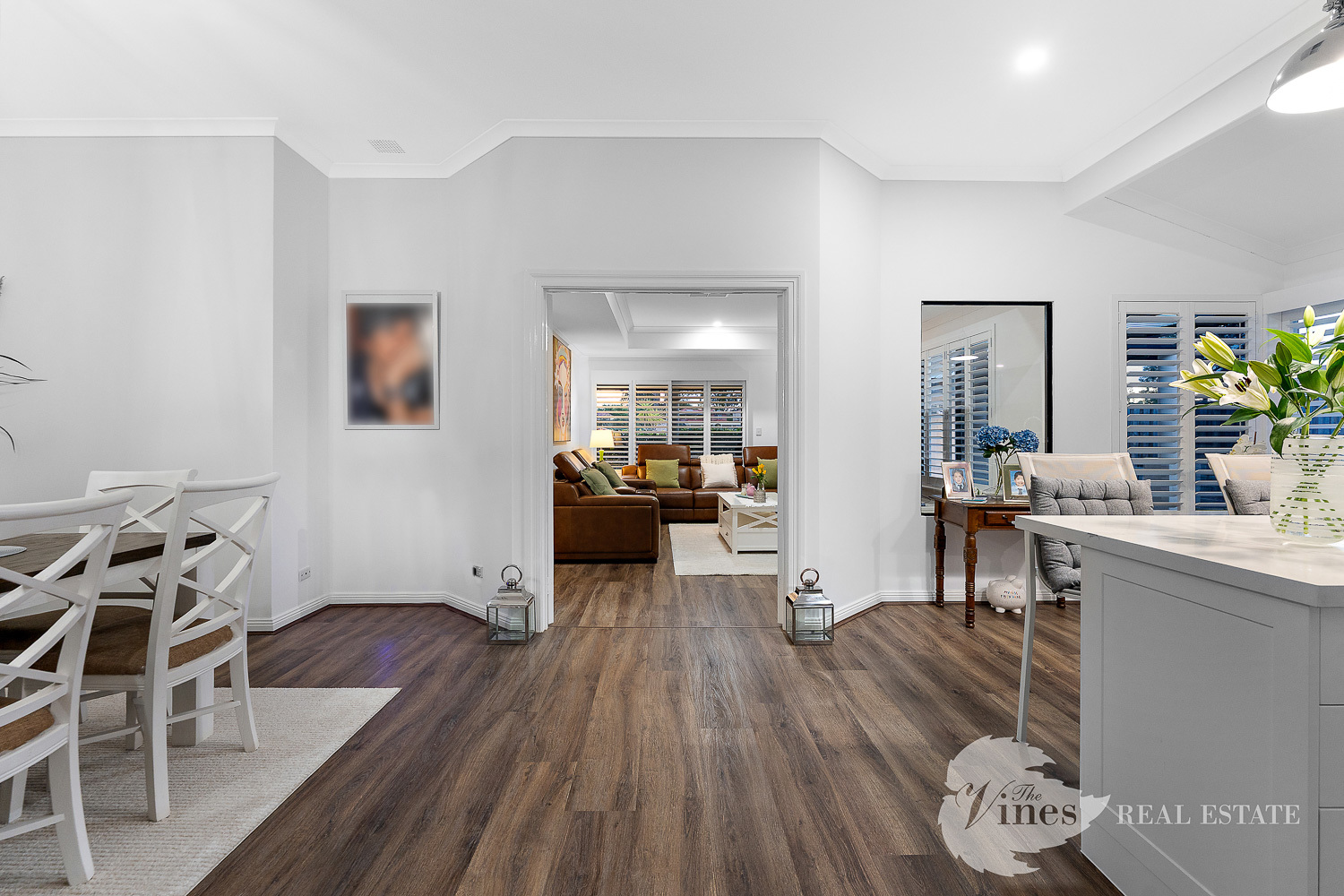 The family room extends seamlessly to the rear of the home, where French doors allow for zoned living, ideal for a kids’ or teenagers’ retreat. With reverse cycle air conditioning, plantation shutters throughout, and a stunning backdrop of the golf course, this home is designed for both luxury and lifestyle.