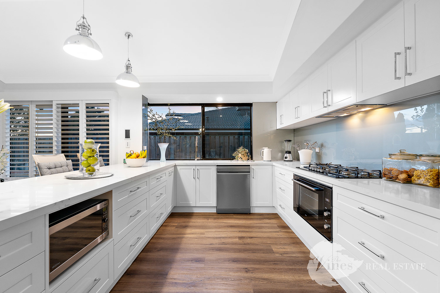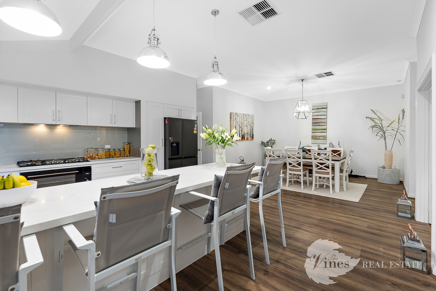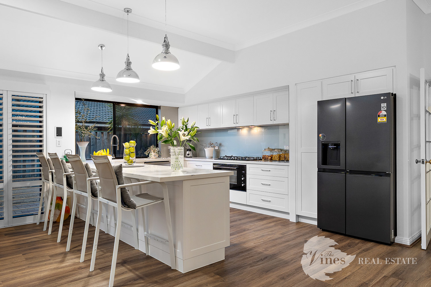 Through double French doors, the main living area opens up with high ceilings, abundant natural light, and a welcoming sense of connection. The kitchen is a showstopper, featuring shaker-style cabinetry, stone benchtops, striking pendant lighting, a 900mm oven and gas cooktop, glass splashback, and plenty of clever storage including overhead cabinetry and drawers. A dedicated dining zone completes the space for effortless entertaining.
